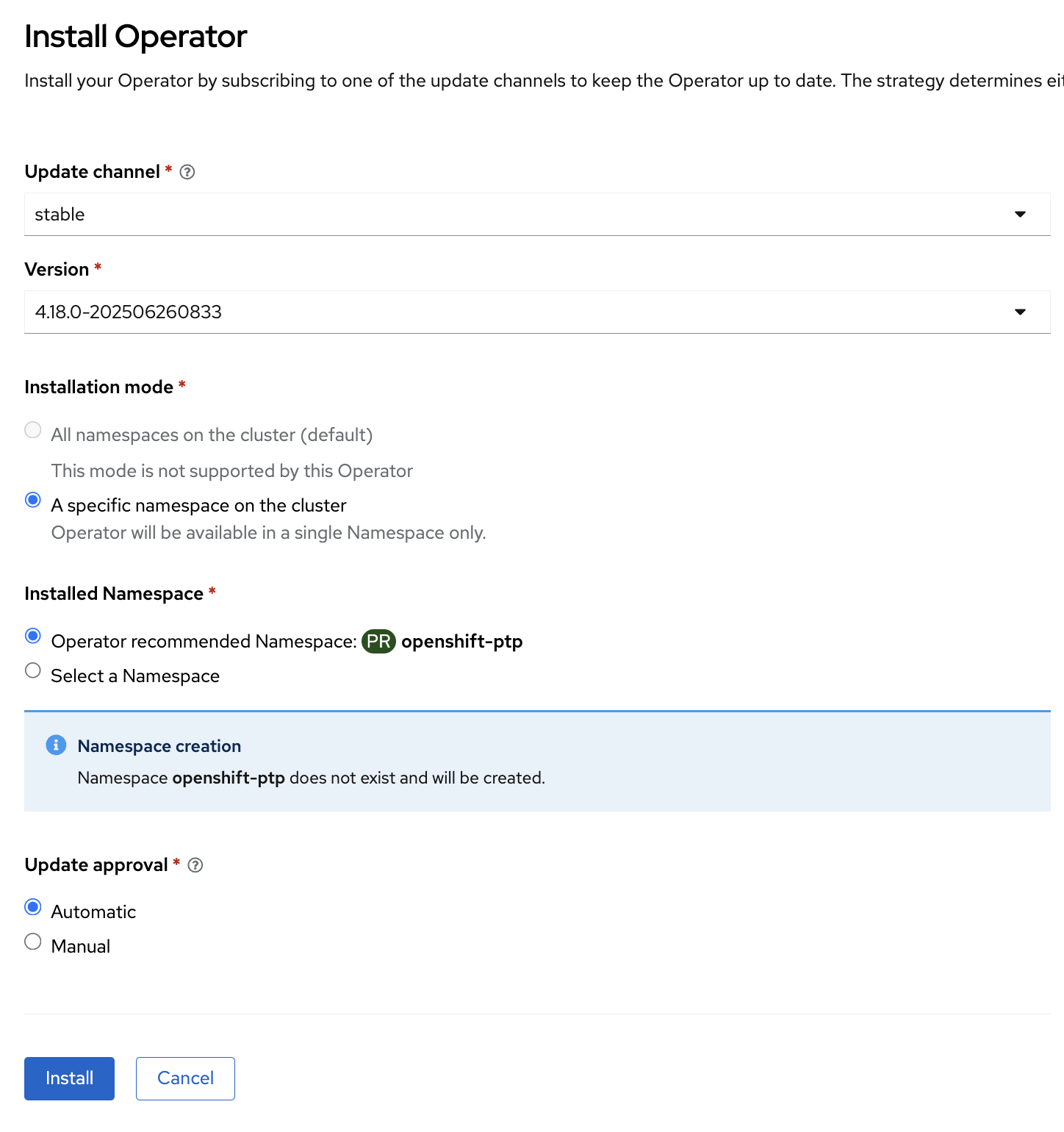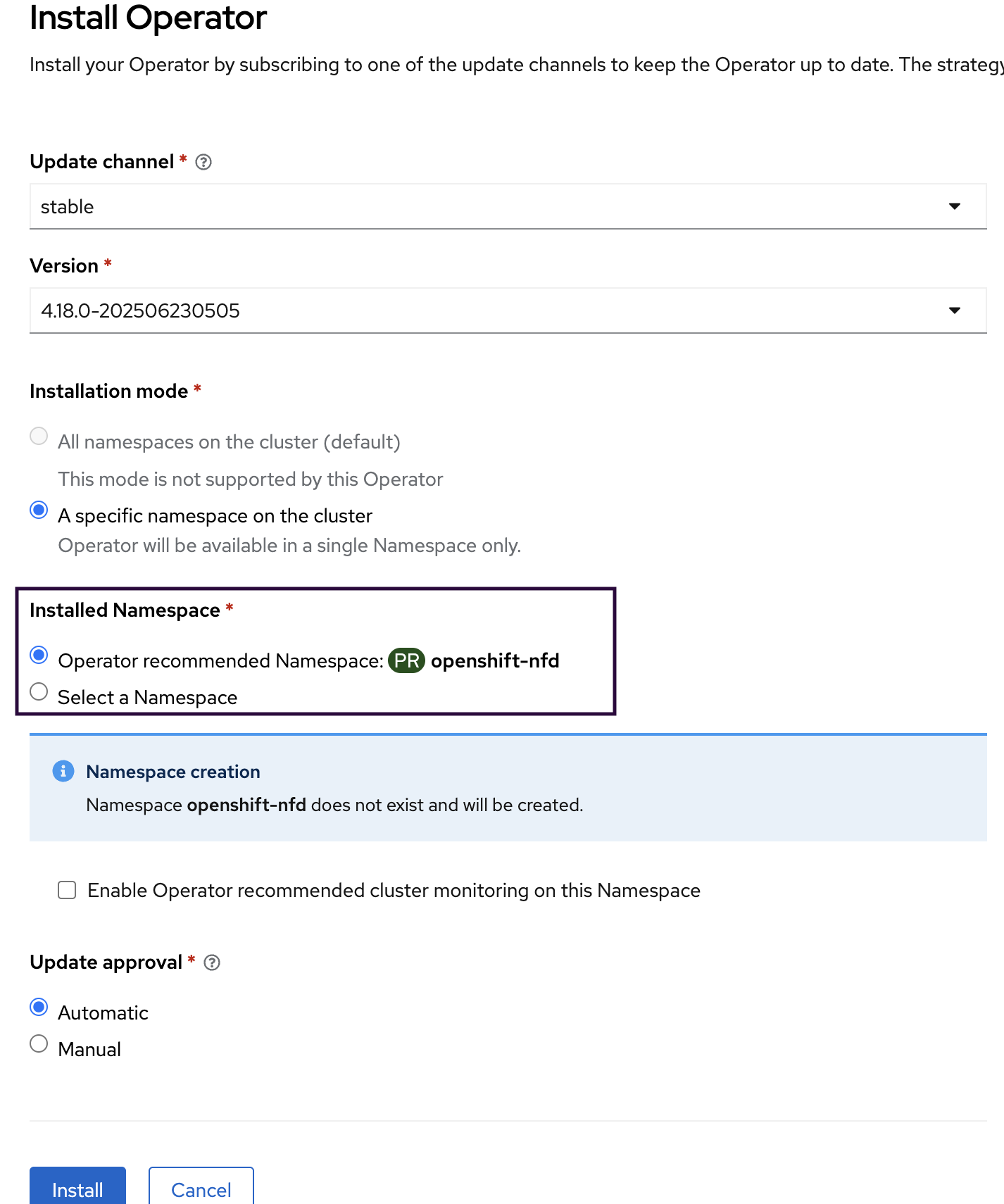 Check A specific namespace on the cluster and click Install.