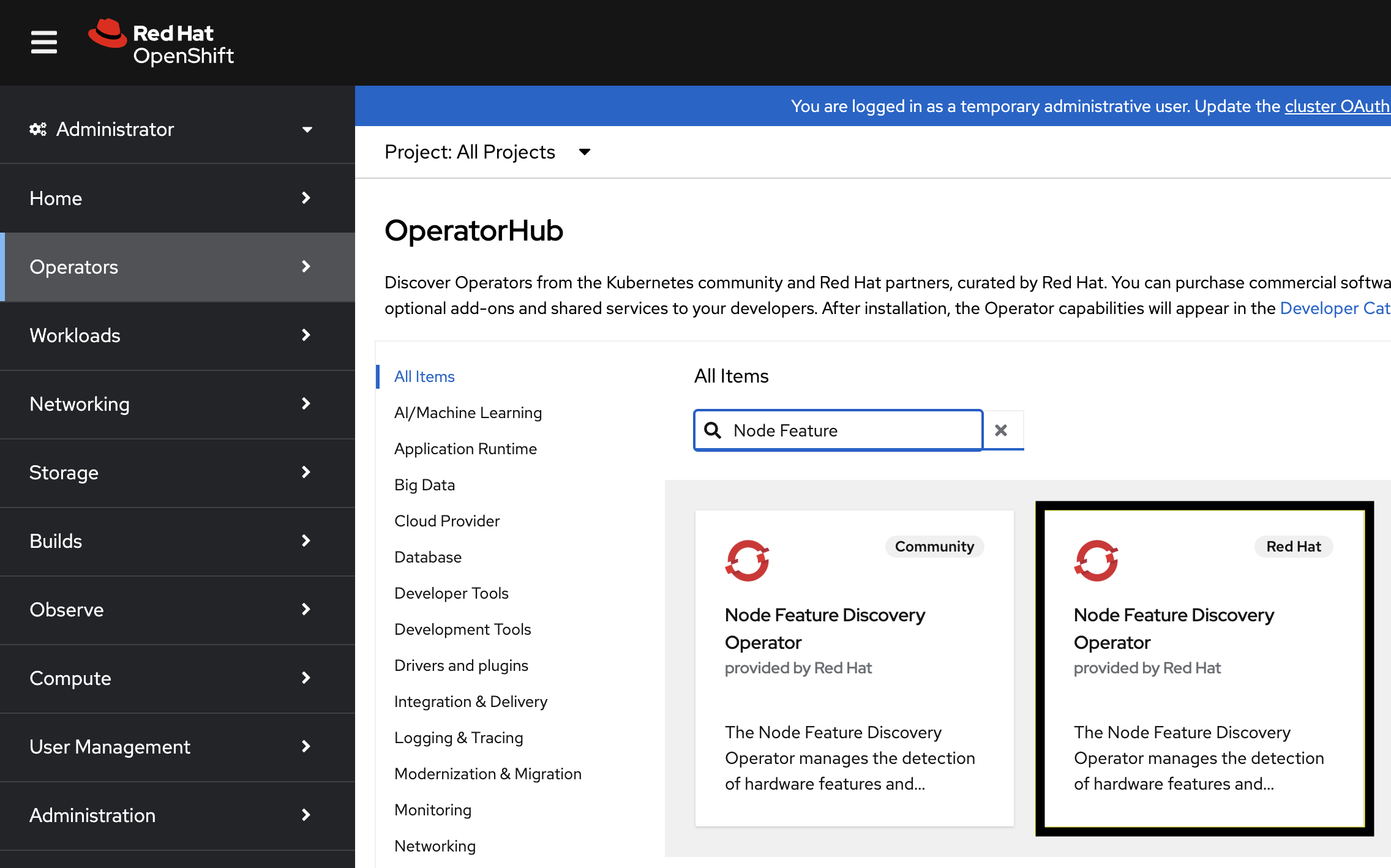 Use the search bar to search for Node Feature Discovery.