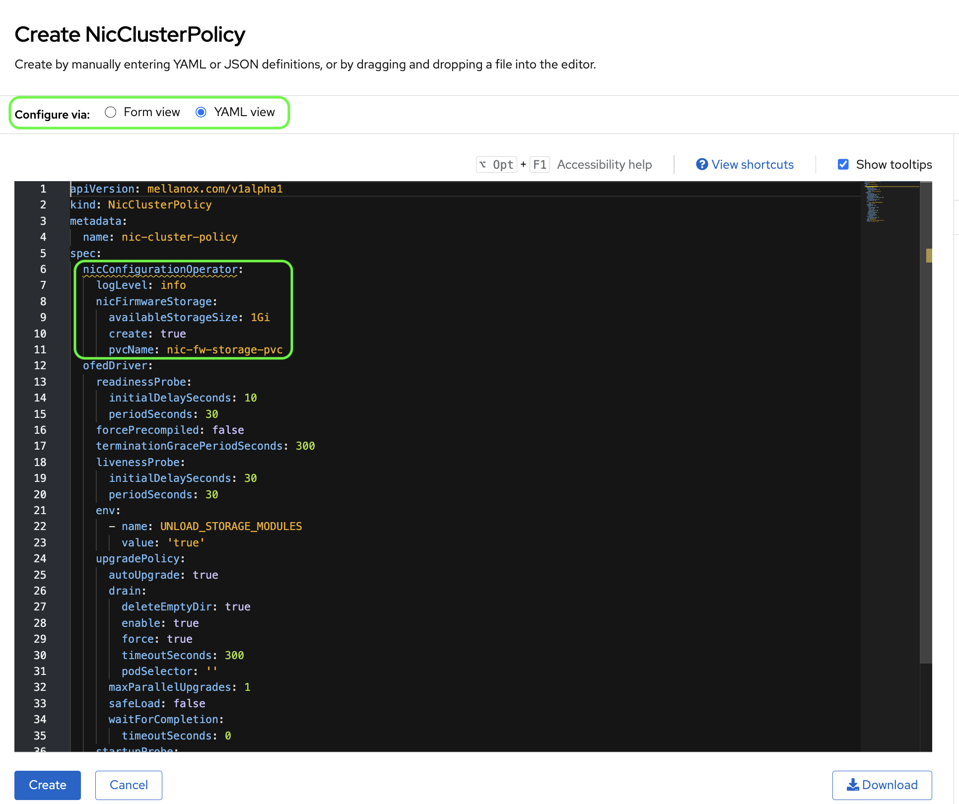 nicConfigurationOperatorsection from the YAML file.Click the Create button.