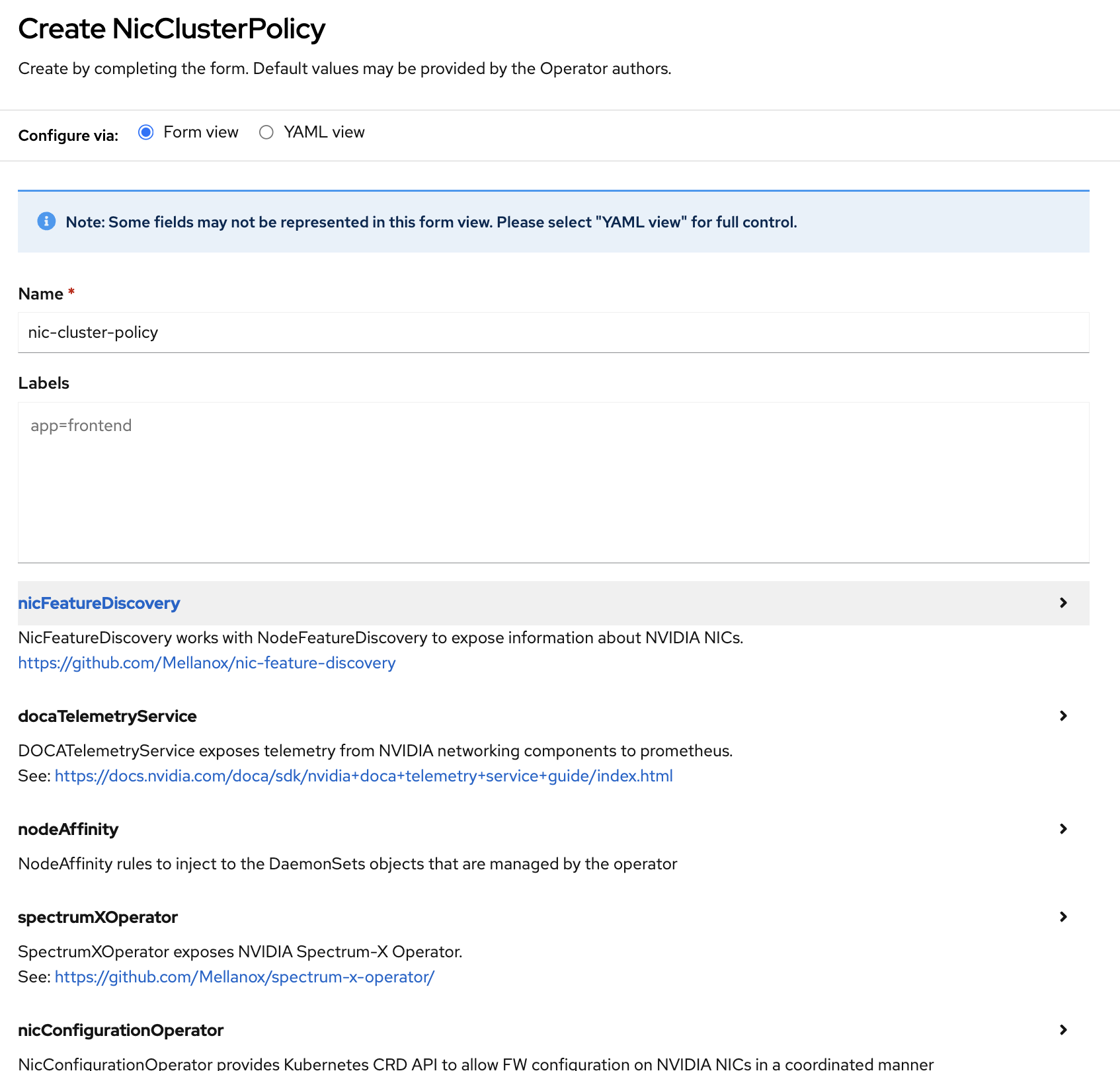 In the NicClusterPolicy tab, make the following modifications: