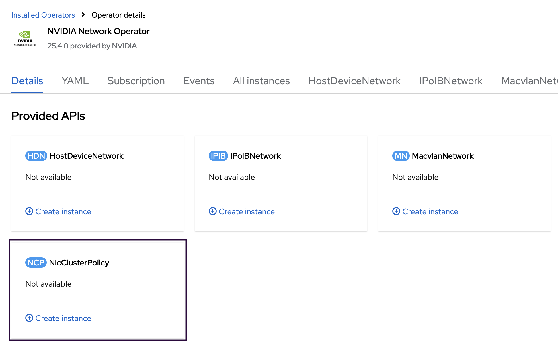 On the NVIDIA Network Operator details screen, click Create instance in the NicClusterPolicy section.