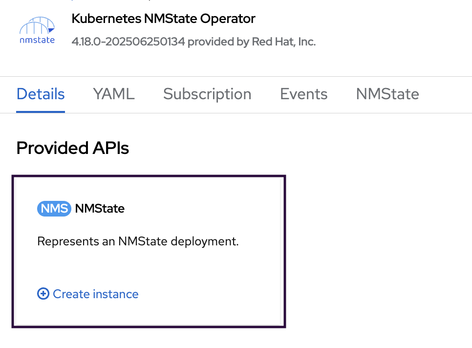 After the installation completes, navigate to the Operators section, click Installed Operators, and select Kubernetes NMState Operator. On the Kubernetes NMState Operator details screen, click Create instance in the Provided APIs section.