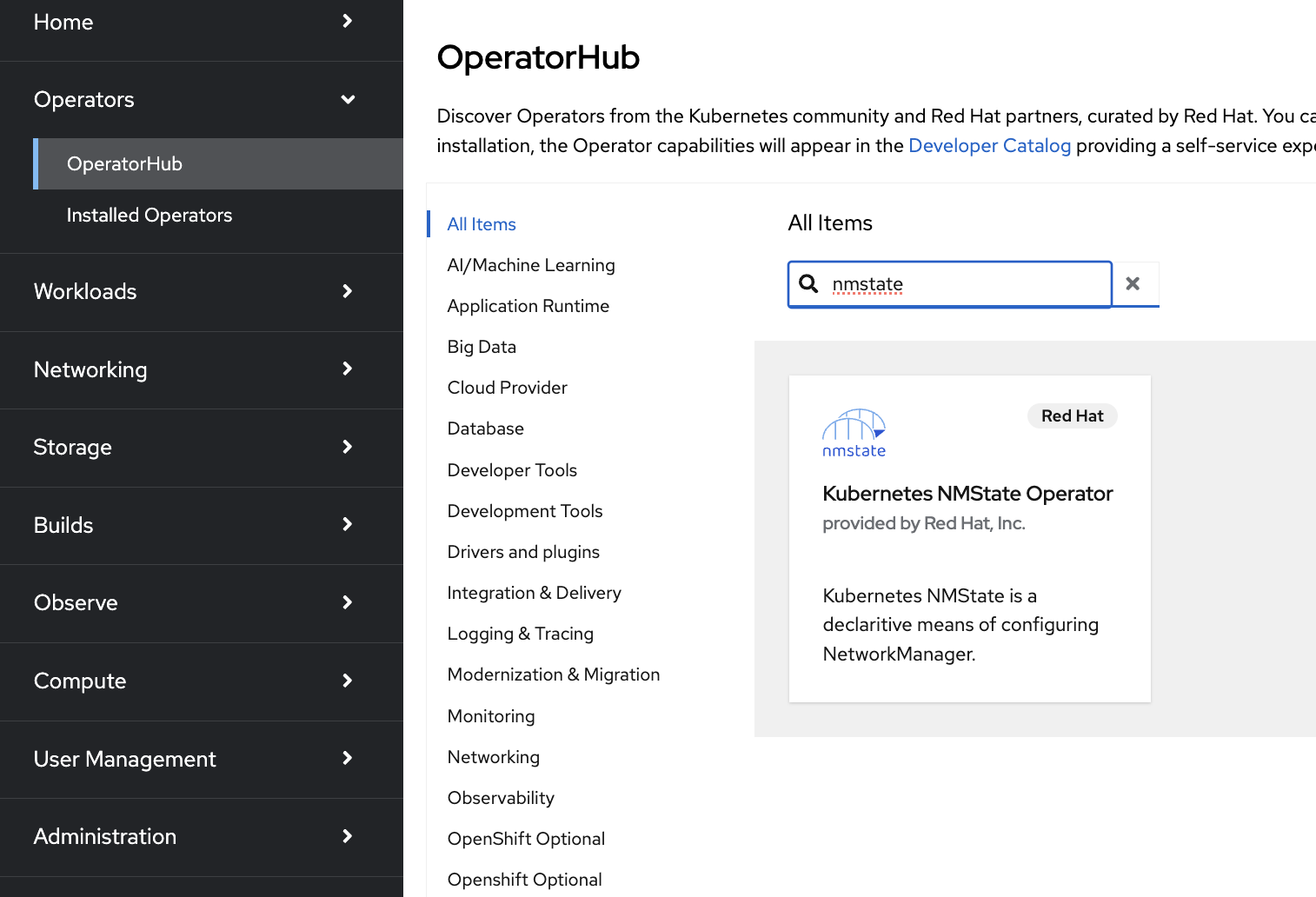 Expand the Operators section and select Operator Hub. Use the search bar to search for NMState. Select Kubernetes NMState Operator.