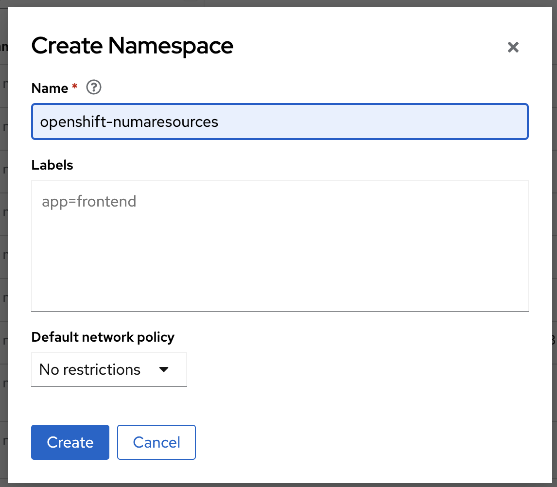 Enter openshift-numaresources in the Name field, and then click Create.