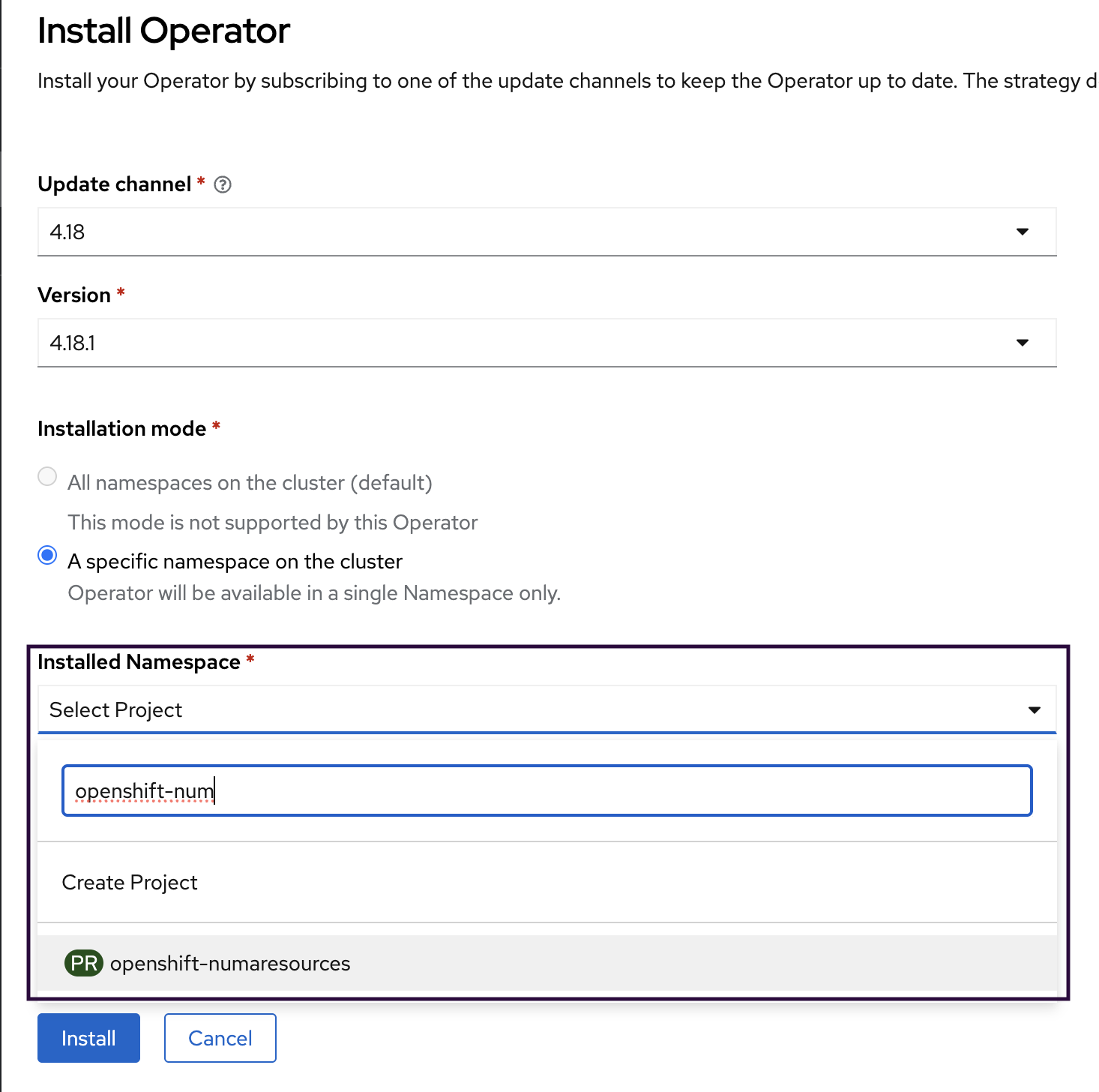 Select Installed Namespace as openshift-numaresources and click Install.