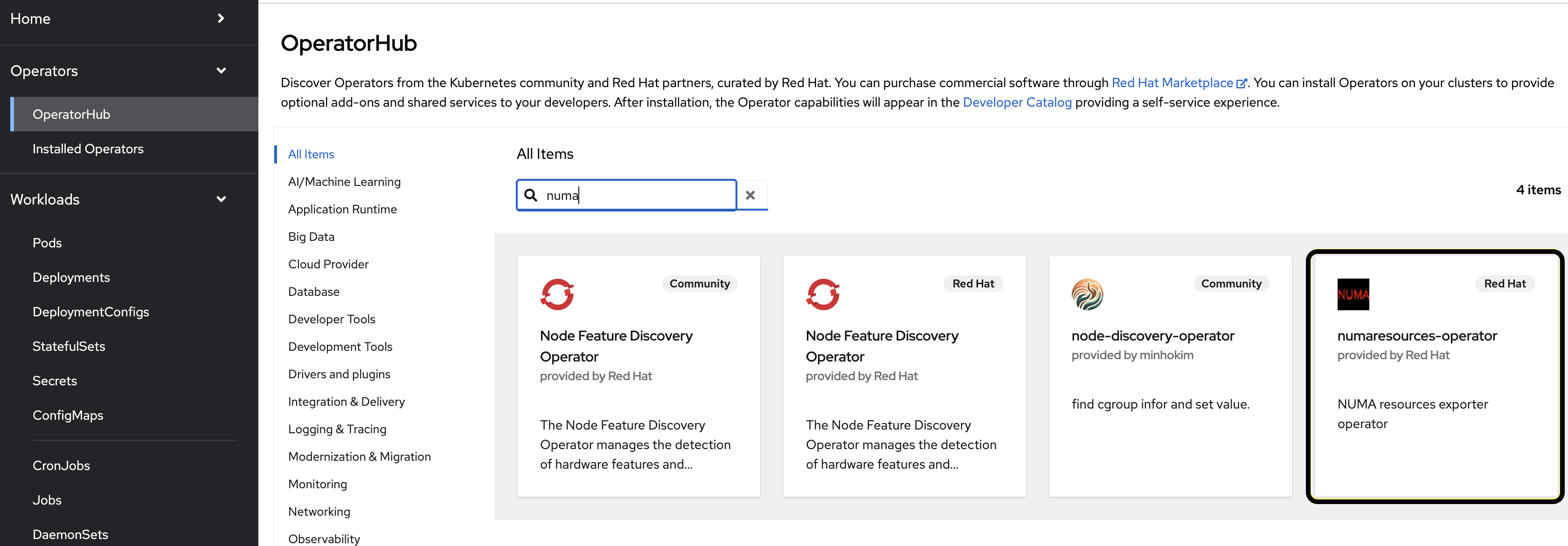 Expand the Operators section and select Operator Hub. Use the search bar to search for numa. Select numaresources-operator.