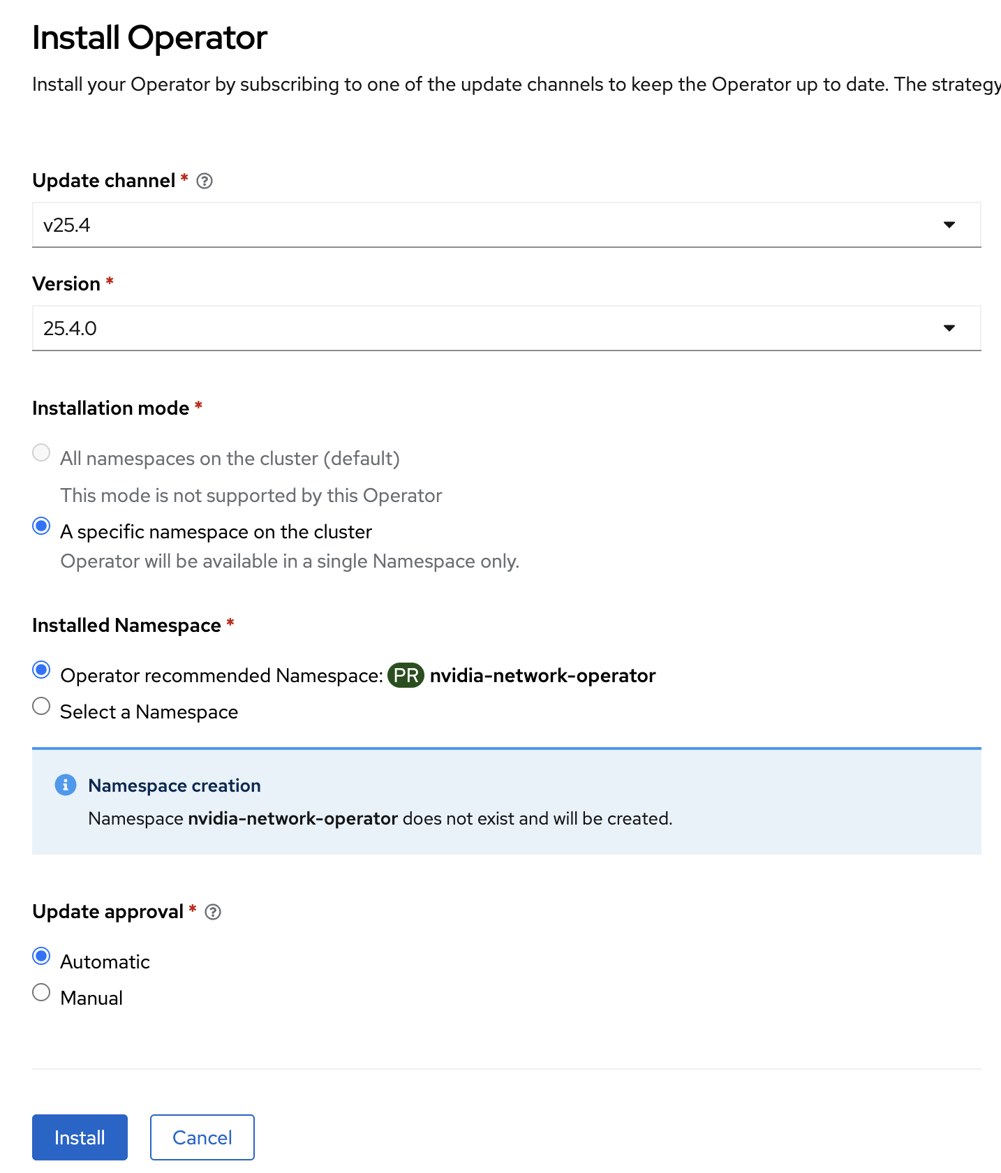 Select Update channel v25.4 and version 25.4.0. Now click Install. Installation will take about 2 minutes to complete.