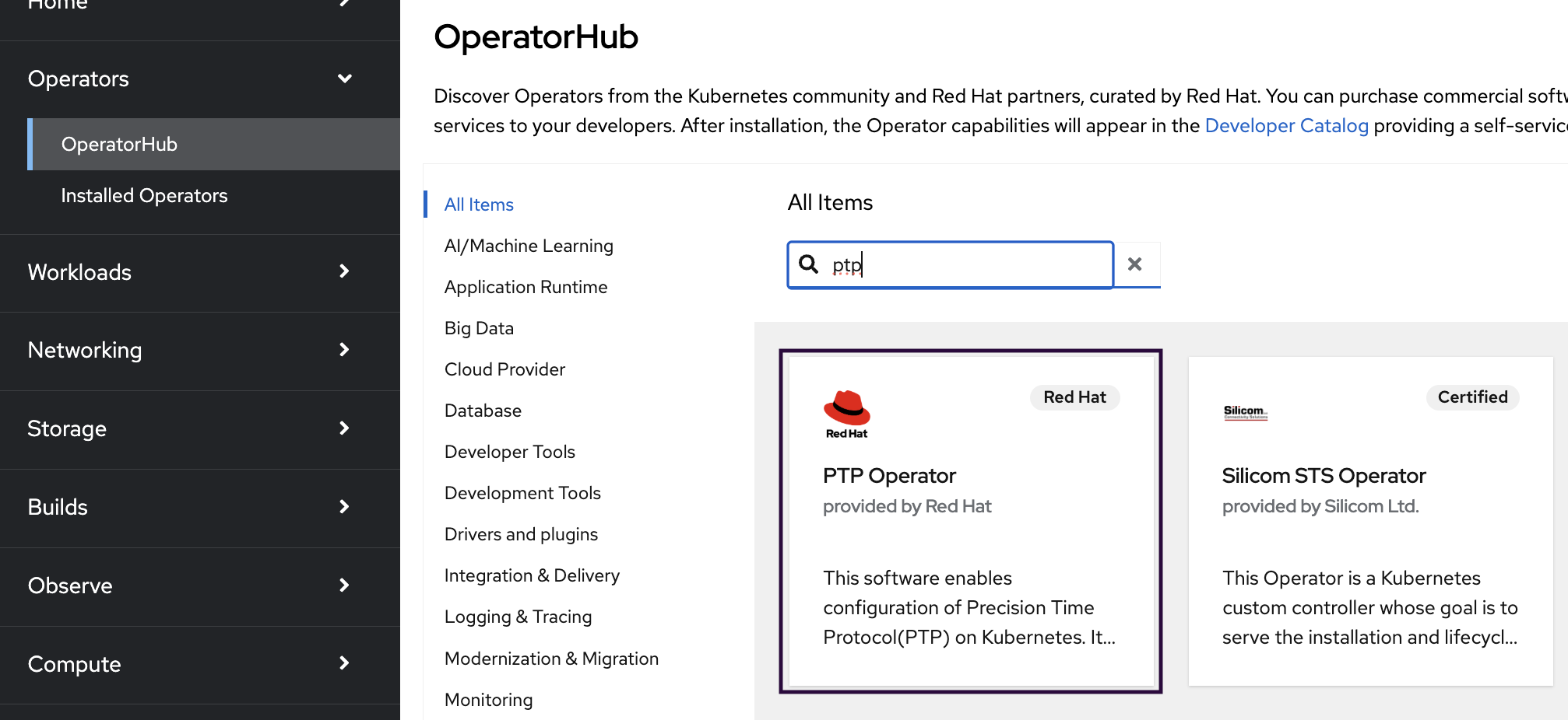 Expand the Operators section and select Operator Hub. Use the search bar to search for PTP.