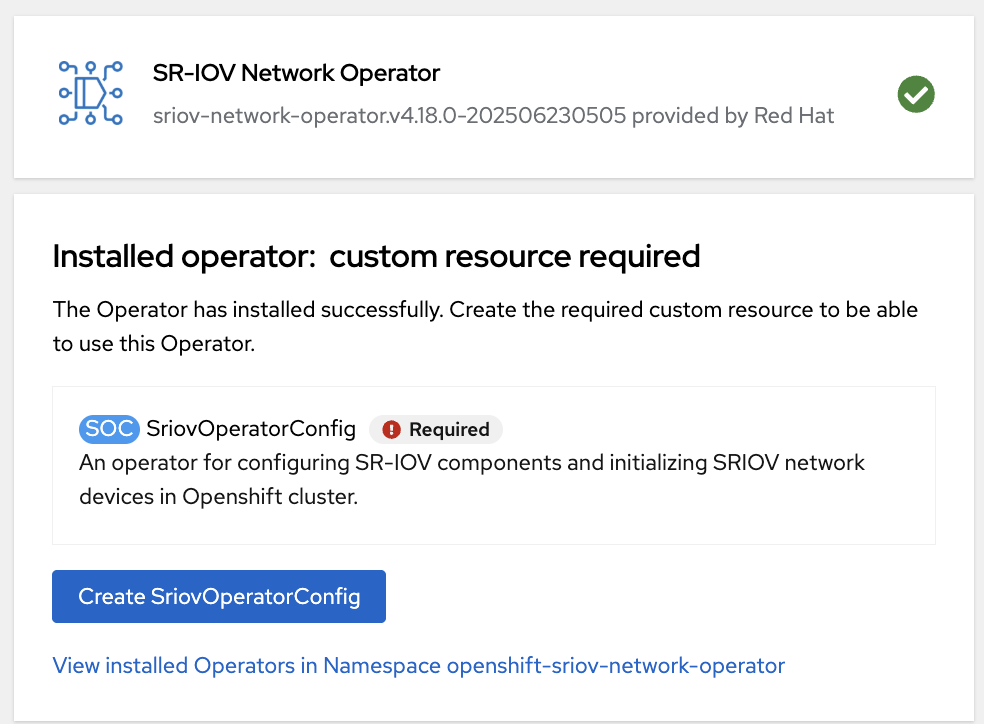 When the installation is complete, click Create SriovOperatorConfig.