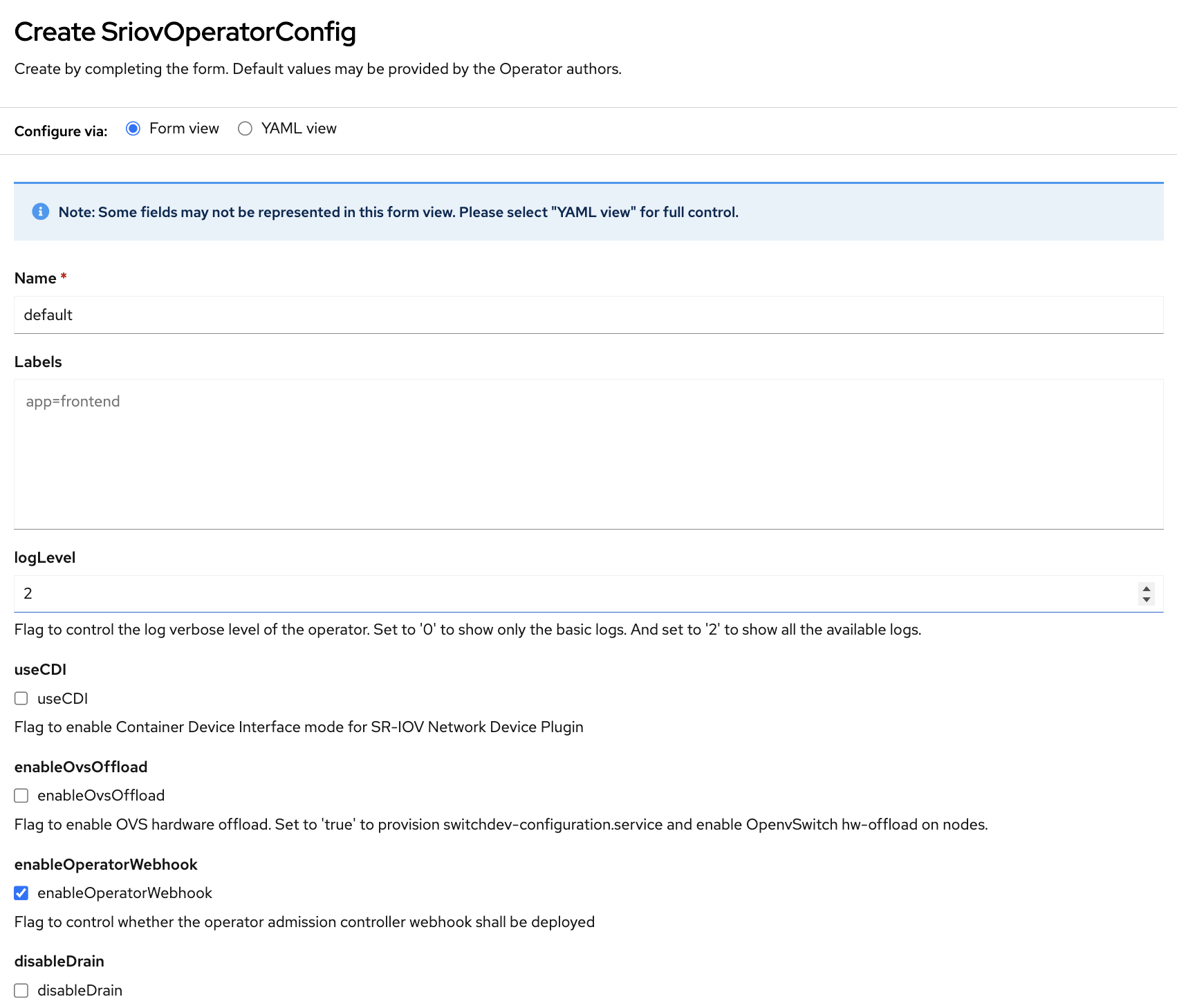 On the Create SriovOperatorConfig screen, click Create.