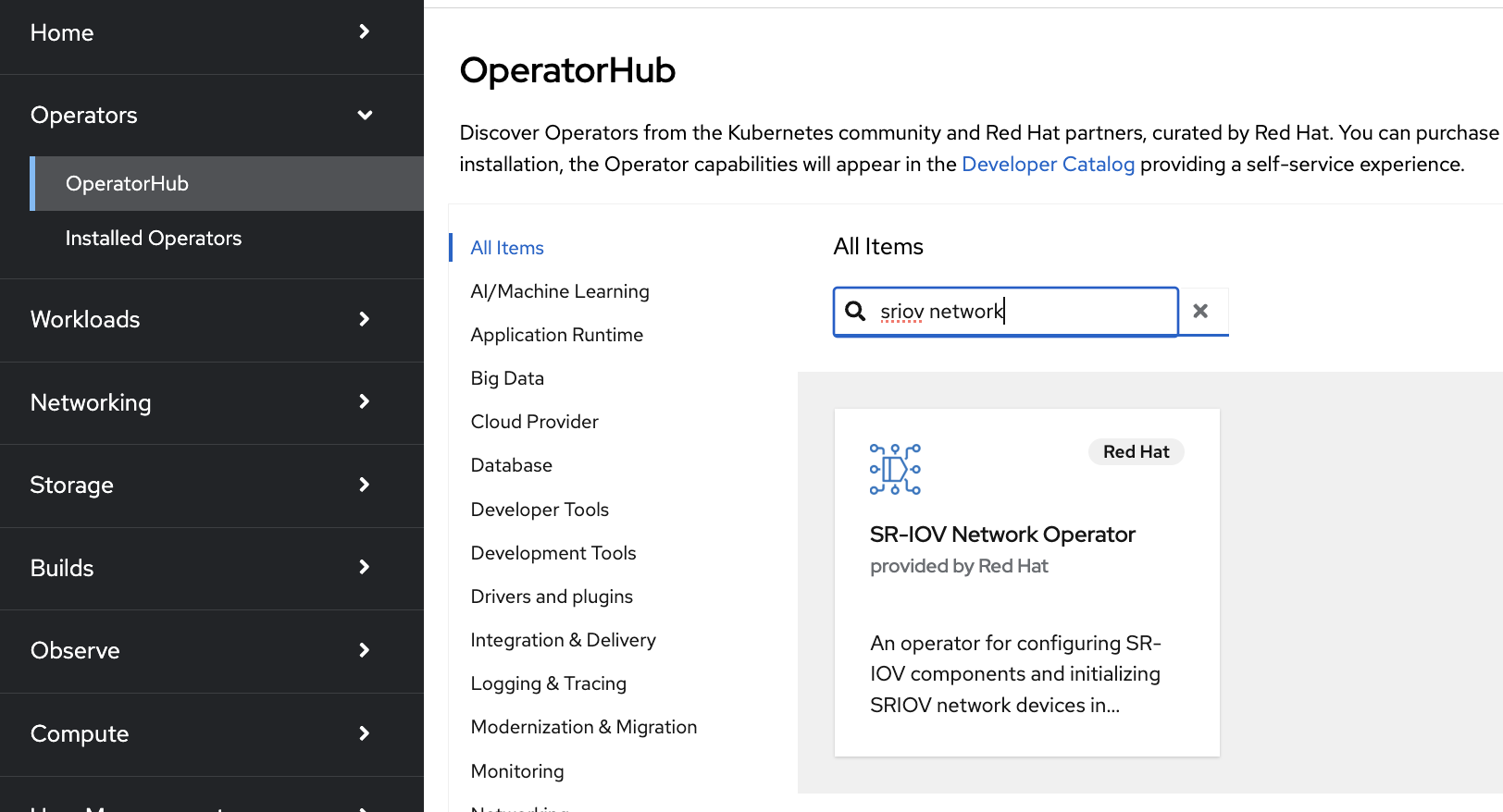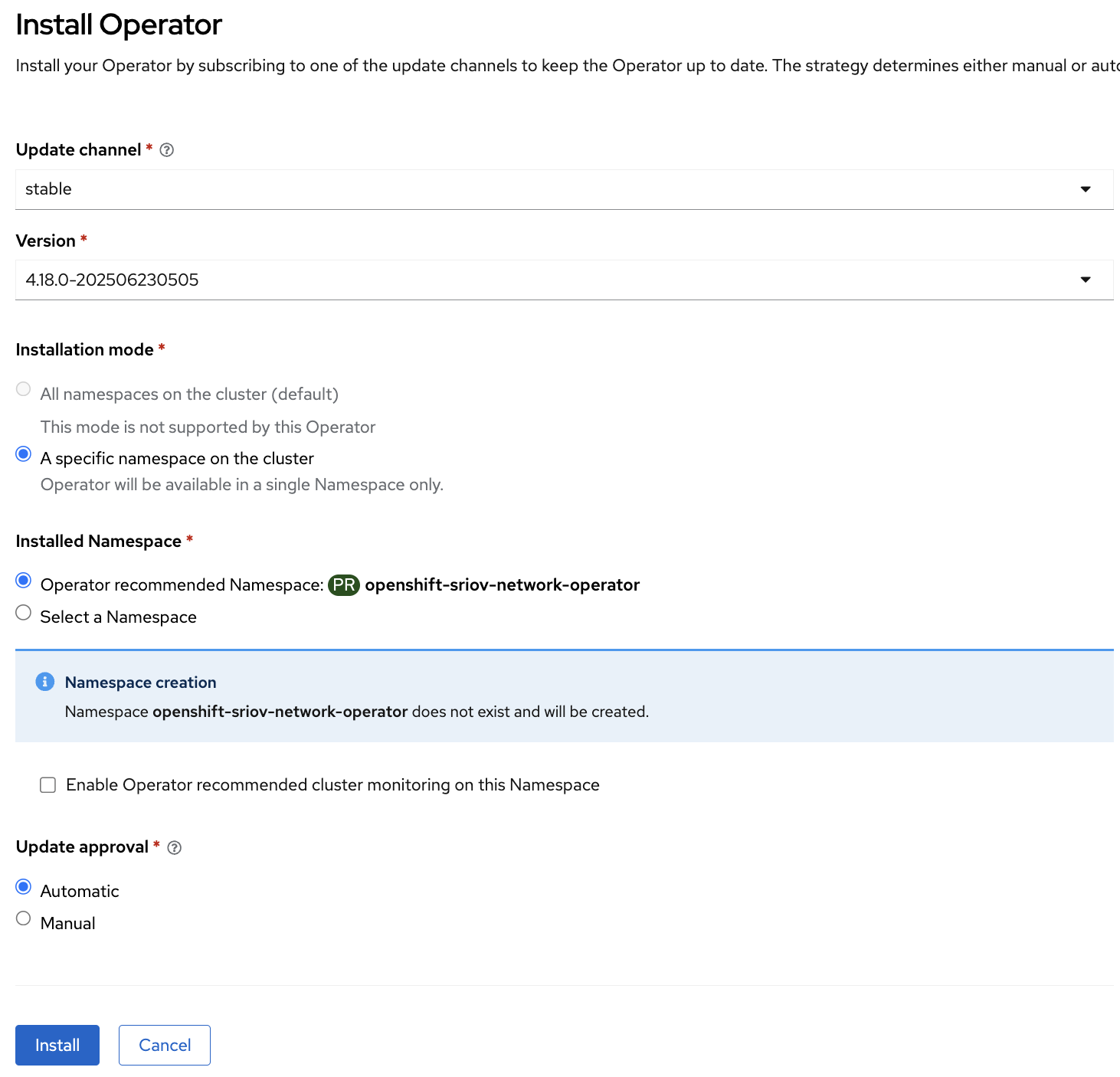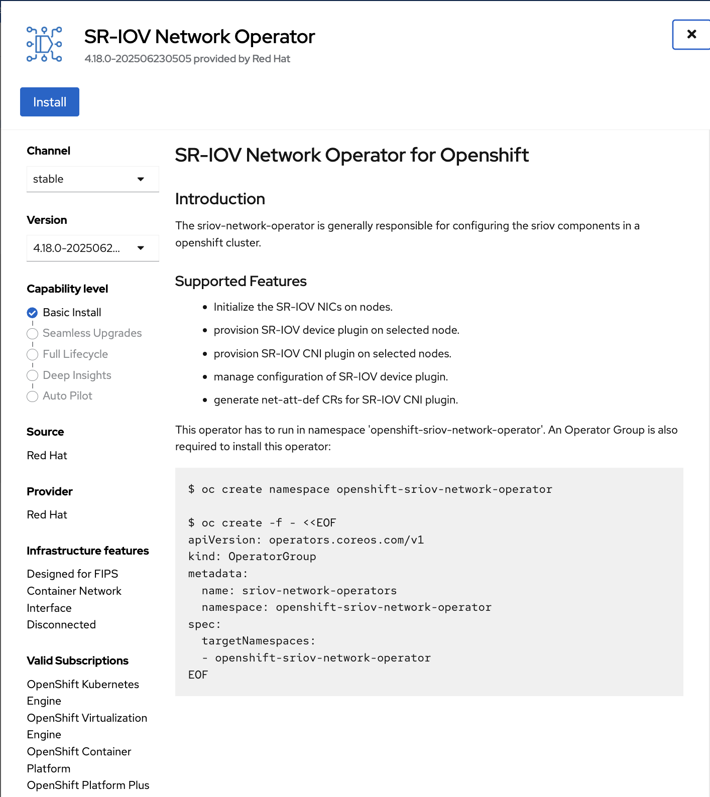 Select SR-IOV Network Operator and click Install in the next window.