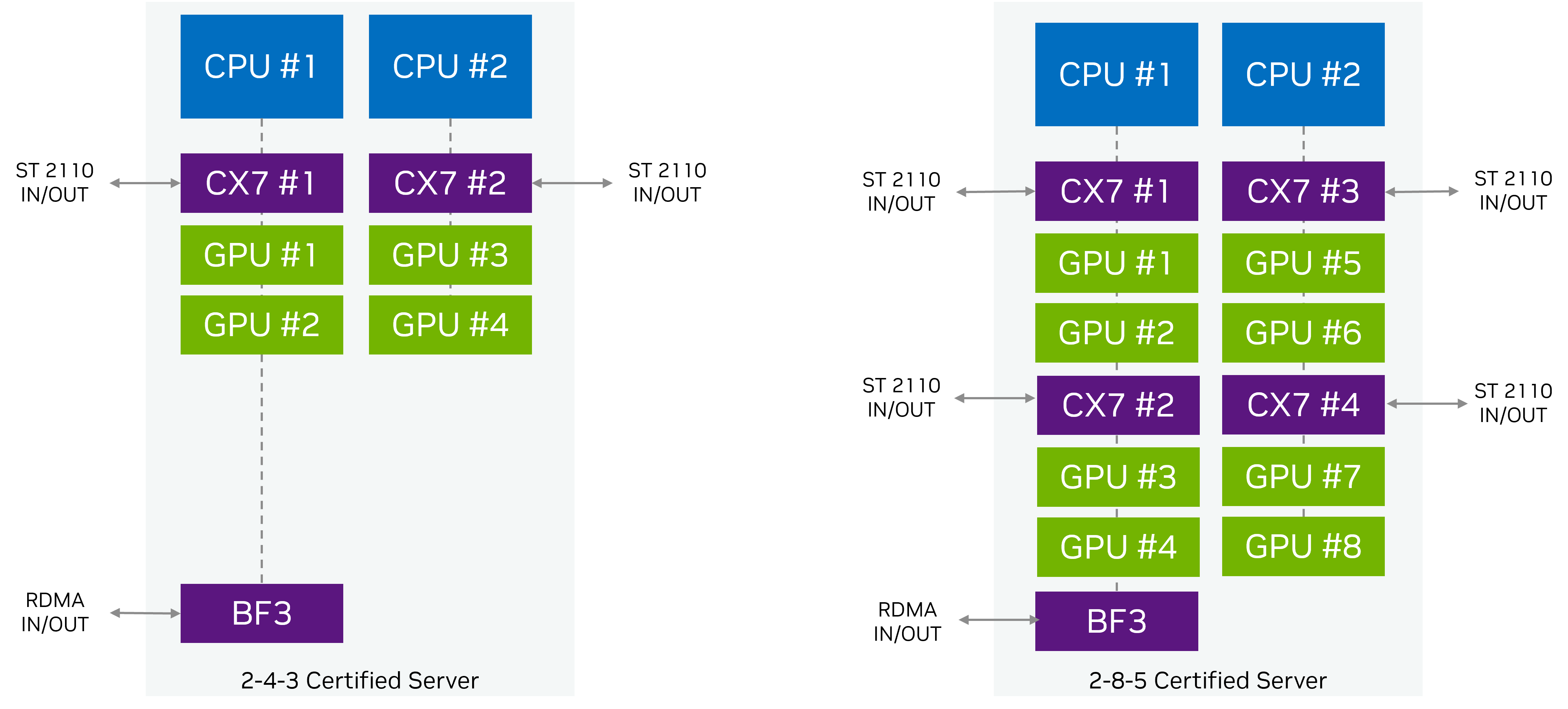 These reference architectures have been designed to ensure maximal throughput between the network and GPUs. Dual-port NICs provide optimal SMPTE ST 2022-7 redundant networking support.