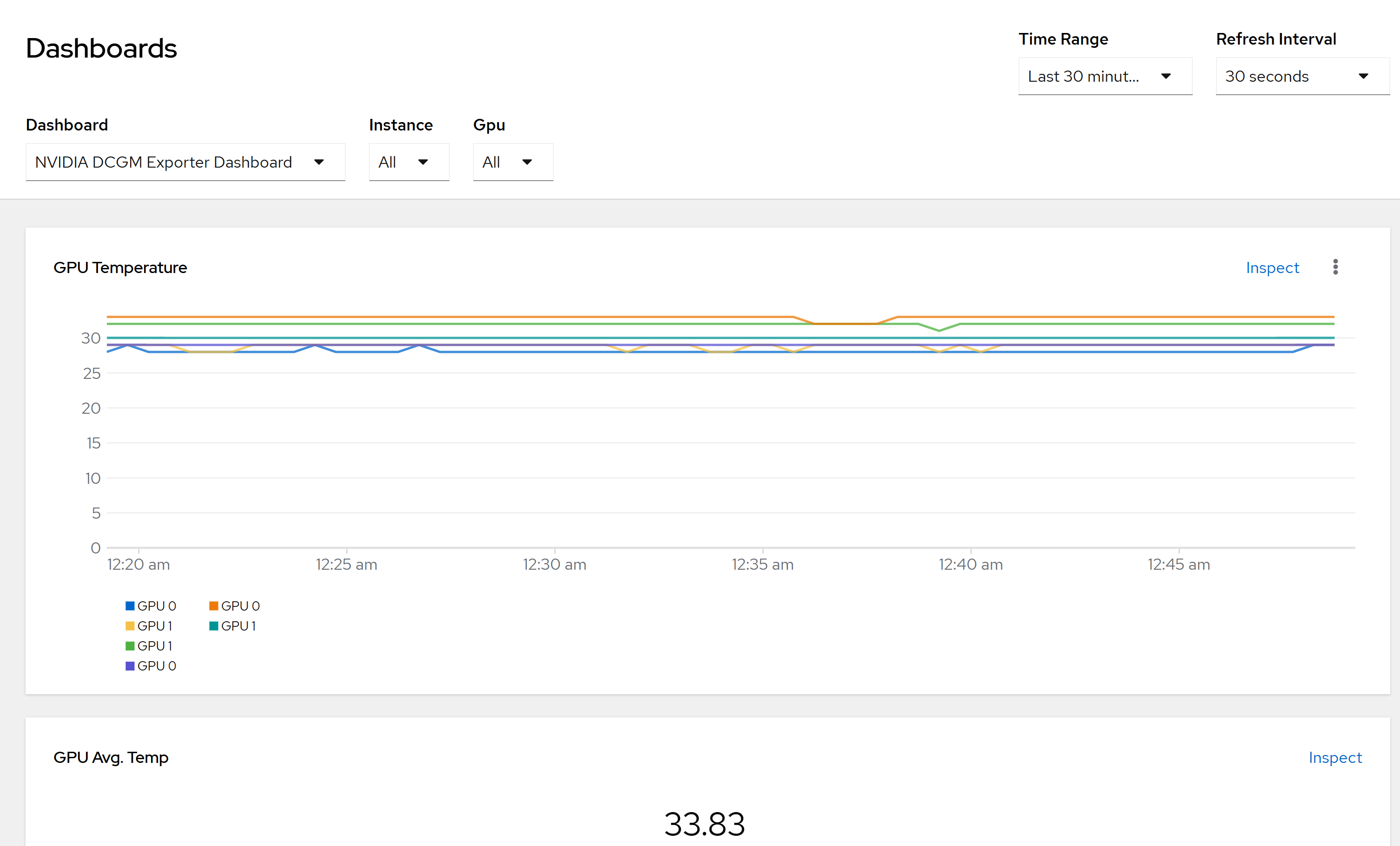 For the local developer setup, the DCGM dashboard is already installed and visible in Grafana. For the production setup, follow the DCGM dashboard installation procedure to enable it.