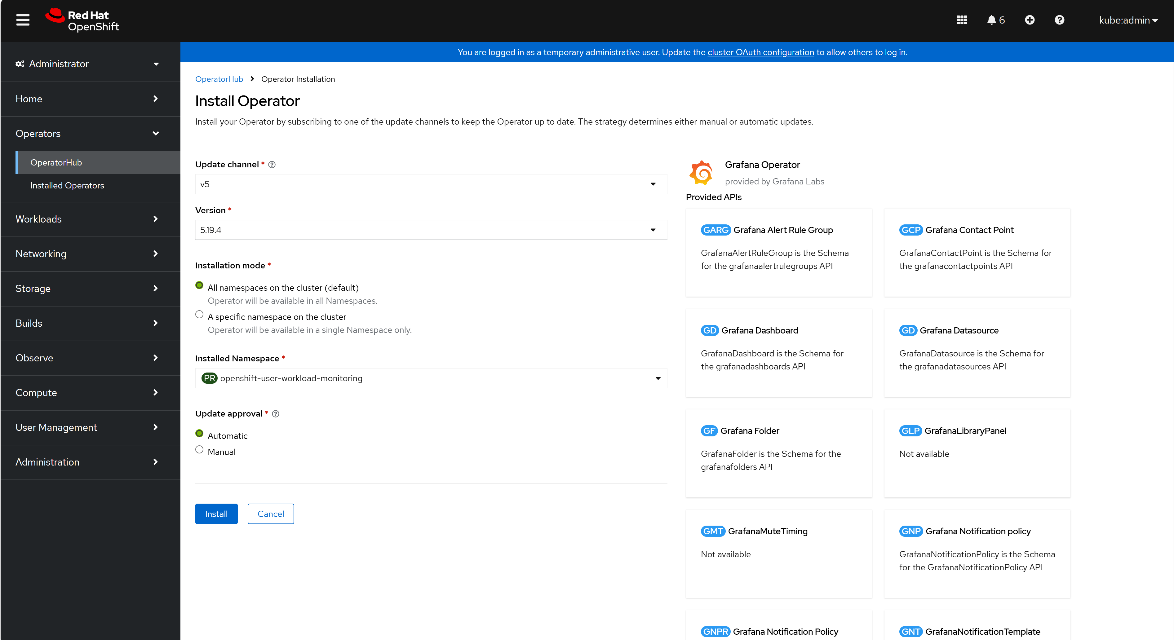 Select openshift-user-workload-monitoring as the Installed Namespace and click Install.