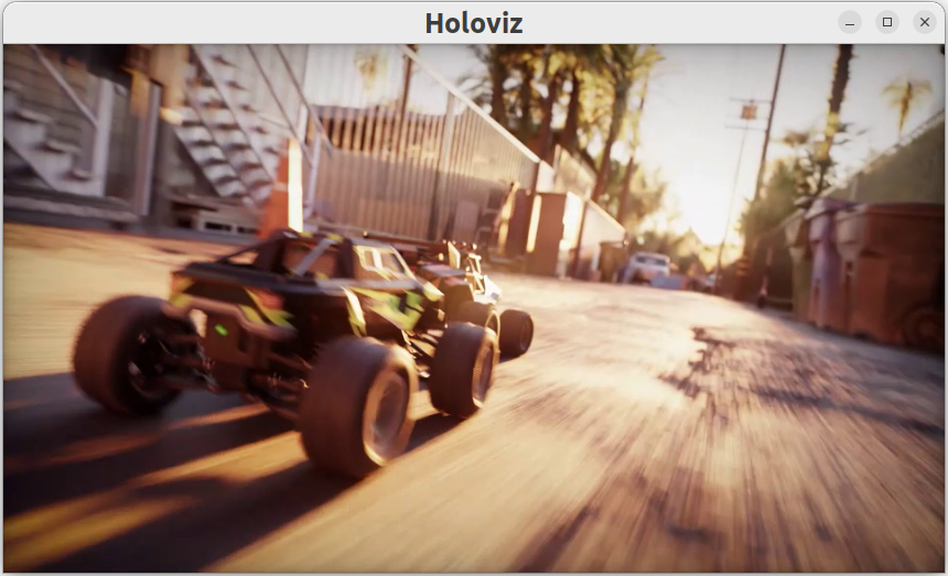 We will use Holoviz to display frames that have been sent by the replayer operator to its “receivers” port which can receive any number of inputs. In more intricate workflows, this port can receive multiple streams of input data where, for example, one stream is the original video data, while other streams detect objects in the video to create bounding boxes and/or text overlays.