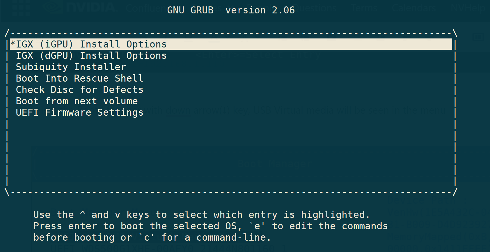 Select the UEFI 0penBMC Virtual Media, and install the IGX OS, or edit options using the e key before installation.