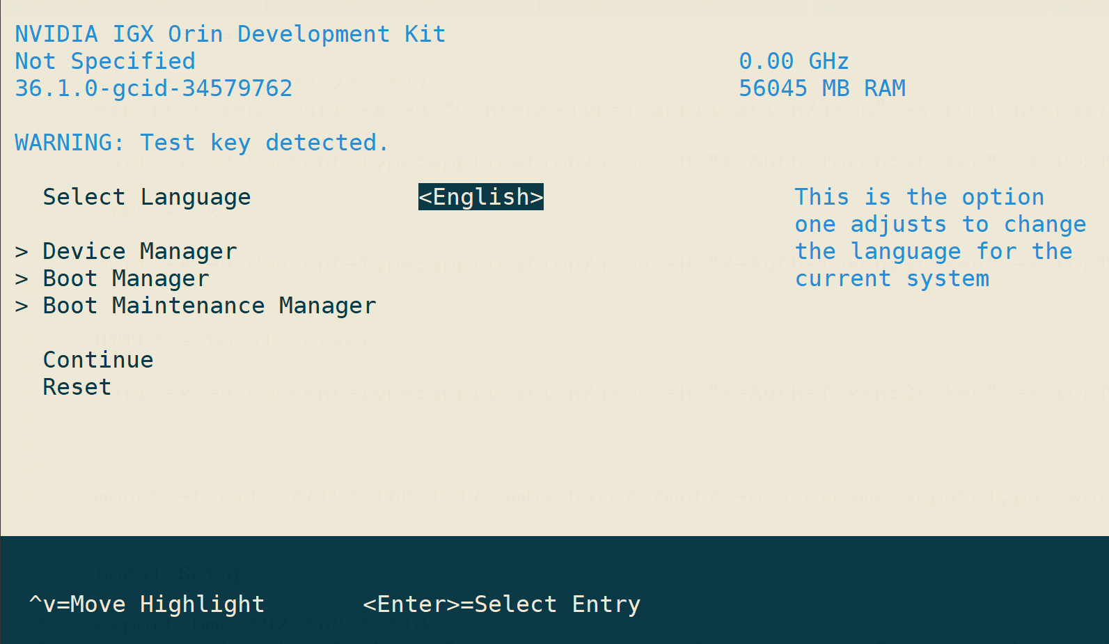 Reboot the Orin/Thor Dev Kit, wait until UEFI starts, then press ESC to enter the UEFI menu