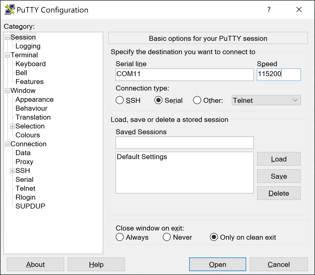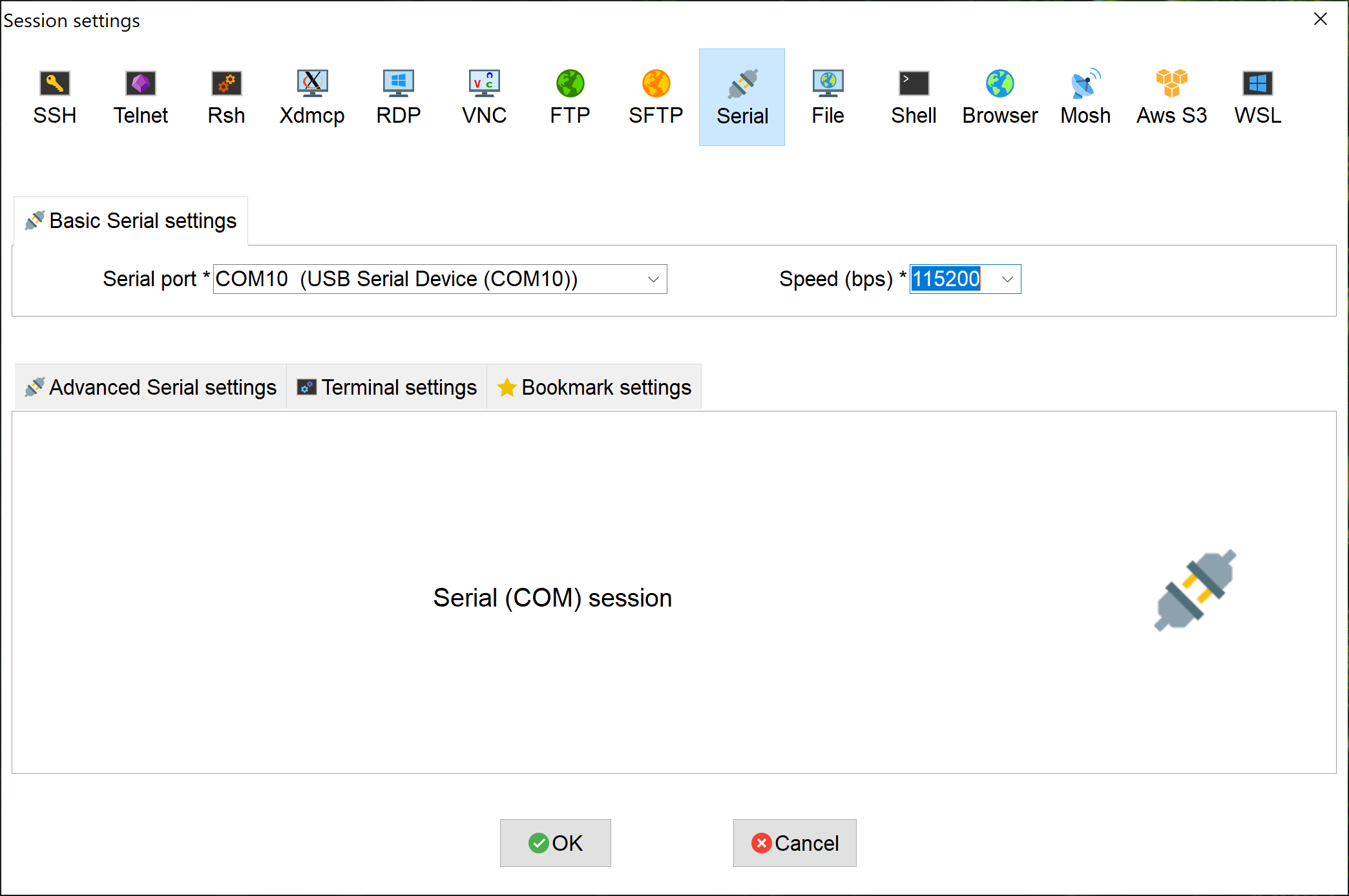 Serialfrom the top bar, select the serial port you verified with Device Manager in the previous step, and setSpeed (bps)to be115200.