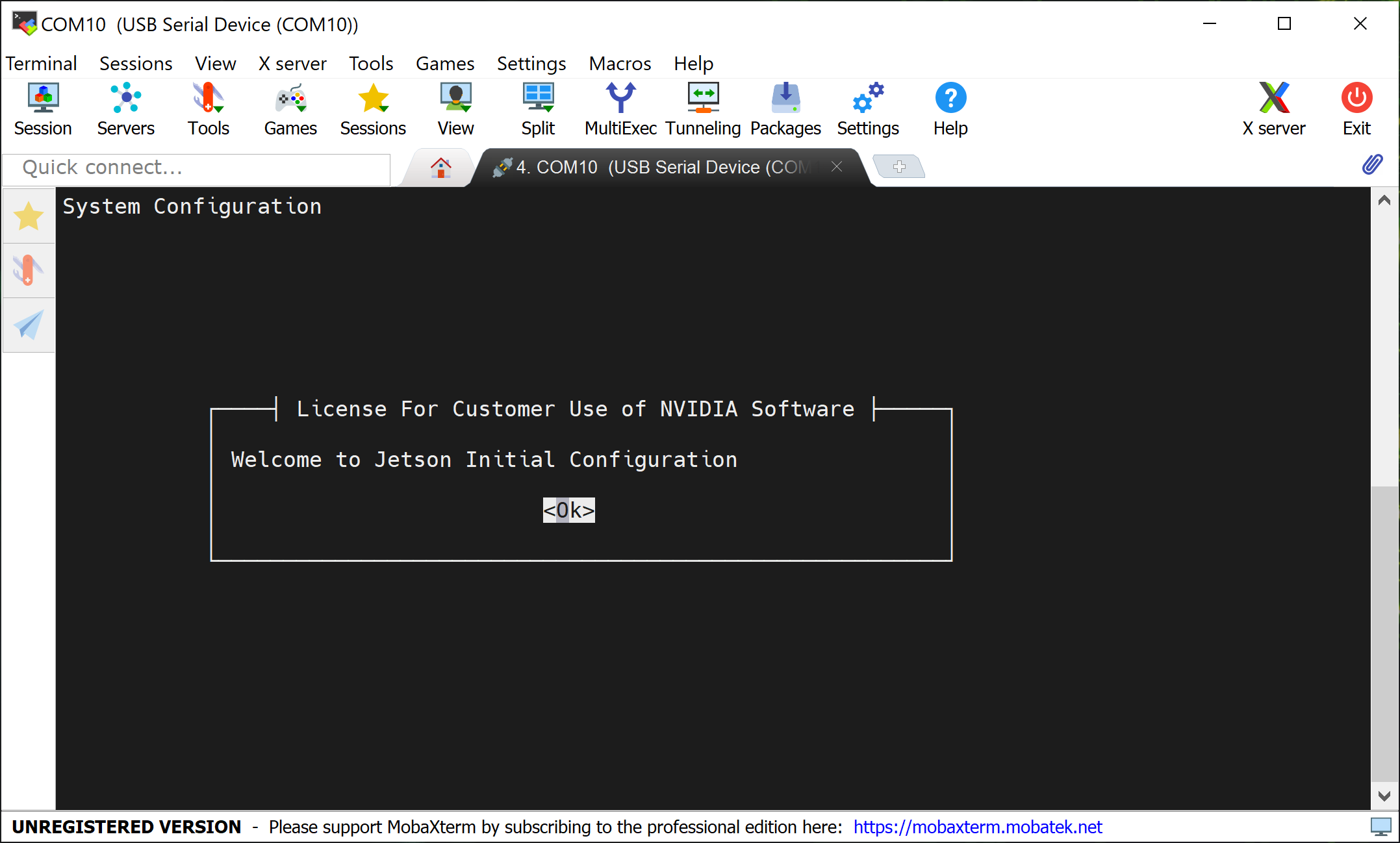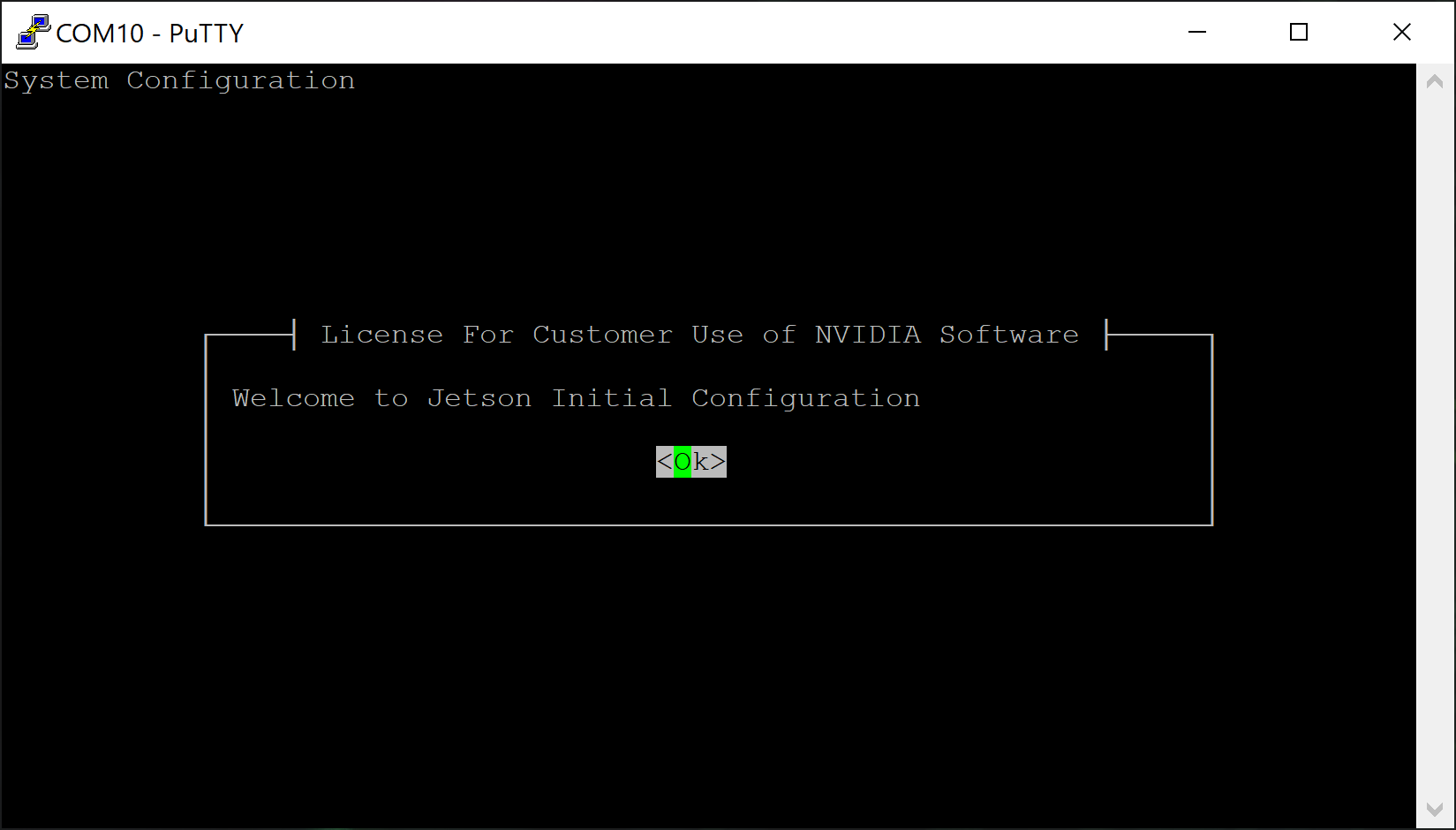 Complete the CUI-based “Jetson Initial configuration” (oem-config) using your PC’s keyboard.