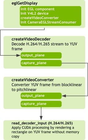 This sample demonstrates how the buffer allocated by the libv4l2 component is used to decode H.265/H.264 video streams, and how CUDA is used aid in rendering images without extra memory copy operations.