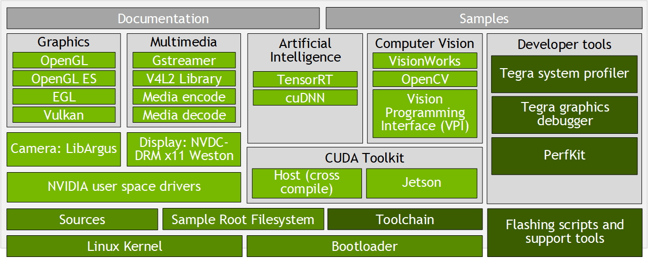 The following diagram illustrates the L4T software stack. Of the Multimedia box (center, bottom), the Multimedia API provides the following components: