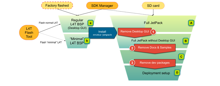 The following graphic provides an overview of the minimal configurations. The jetson-min-disk documentation introduces multiple configurations ([A] to [D]) for different development and product needs.