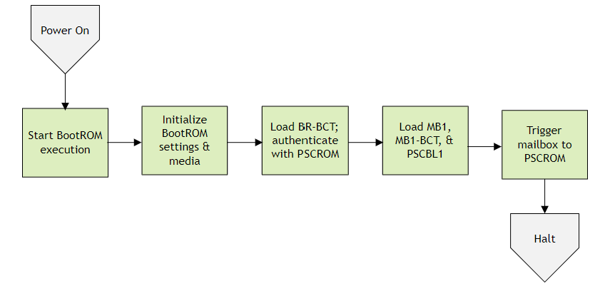 BootROM (BR) is hard-wired into the SoC. It starts executing as BPMP leaves the reset state. It initializes the boot media and loads BR-BCT, PSCBL1, Microboot1 (MB1) and MB1-BCT from storage, and then halts.