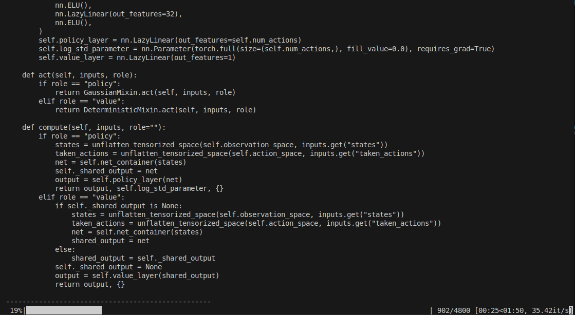 This runs the training script for the SKRL reinforcement learning library, using the task we just generated a project for: Template-Cartpole-v0