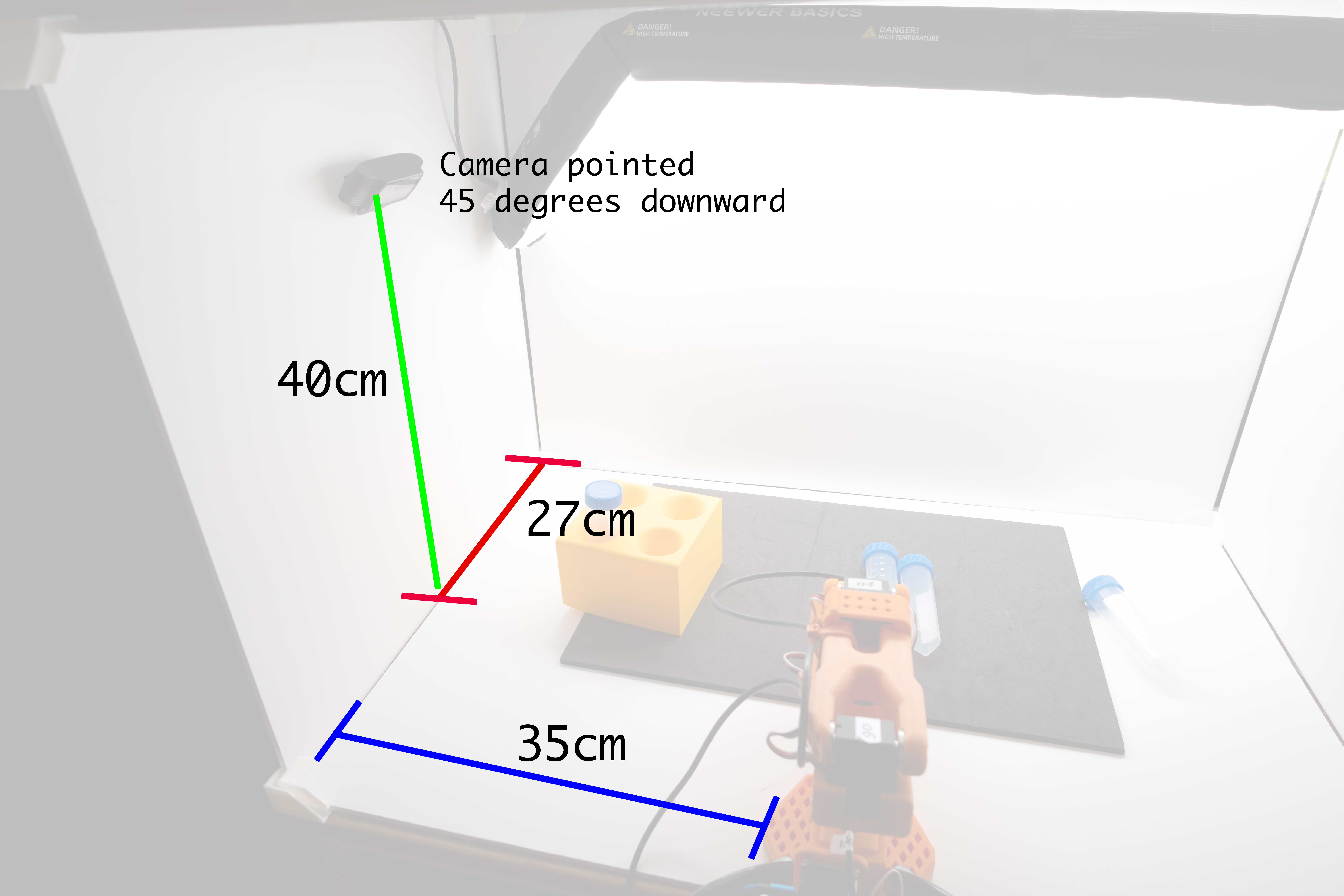 Our simulation environment and checkpoint models are overfit to the rack generally being on the left side and vials on the right. Use the reference photo above for positioning.