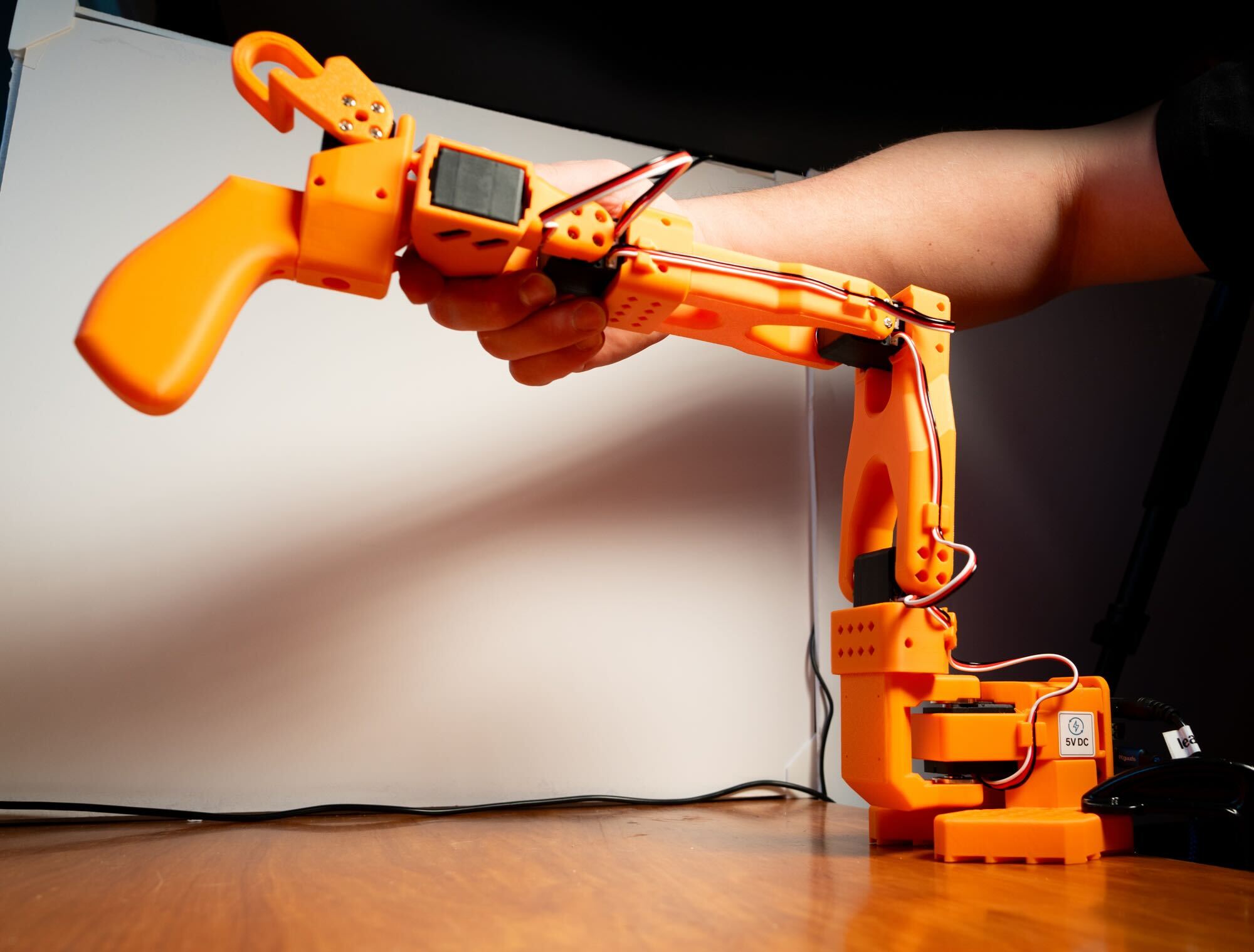 The teleop arm uses a lower voltage power supply (5V) compared to the follower (12V).