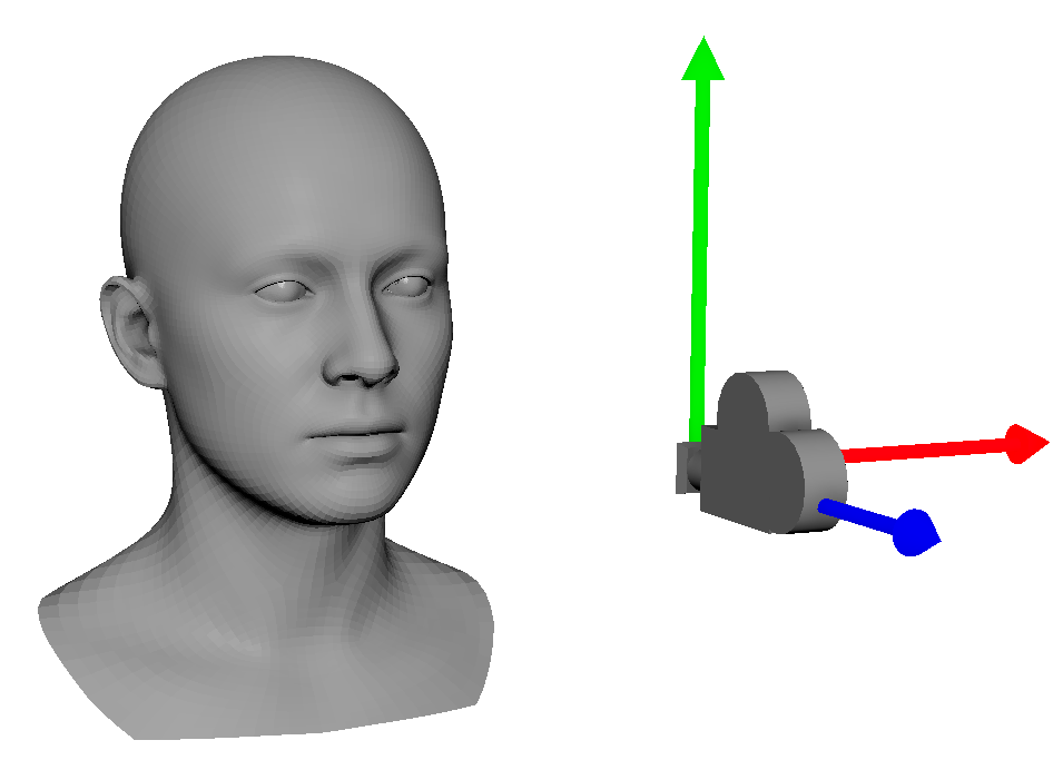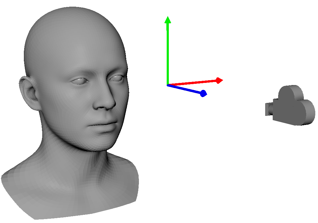 In NvAR Model 3D space, or simply the model space, a face model has its origin in the center of the skull where the first neck joint would be placed. The reference frame is right handed, and the coordinate units are centimeters. The positive z-axis points out from the nose of the model, the x-axis points out from the left ear, and the y-axis points up from the head.