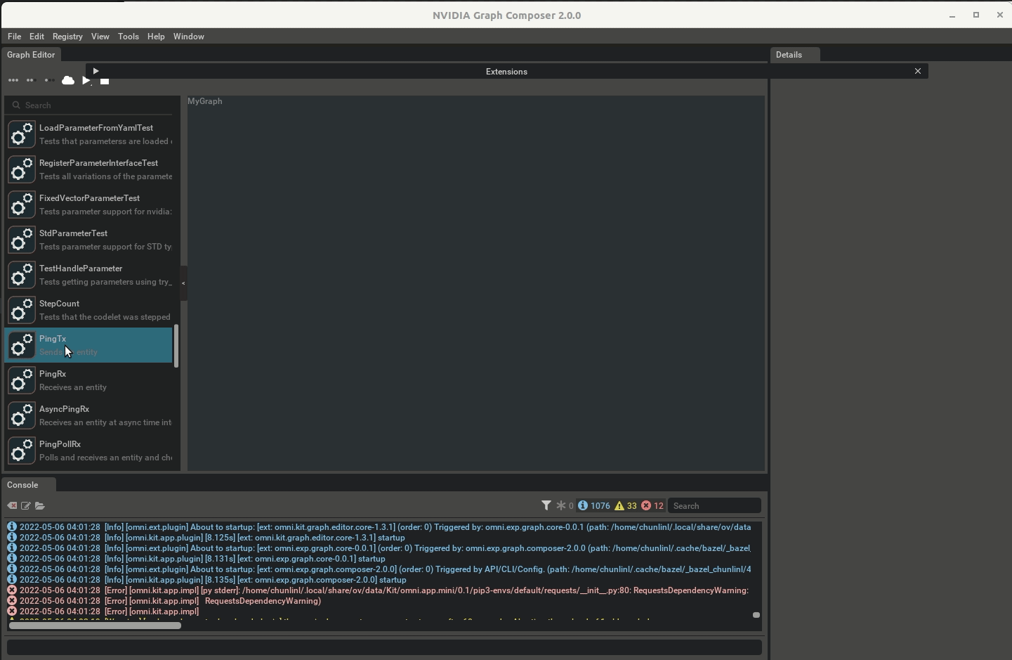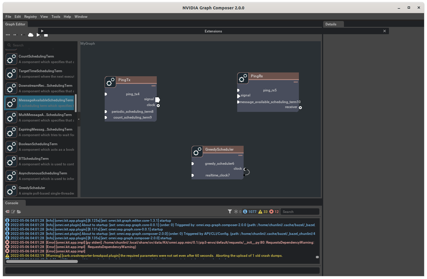 Now, let’s create a simple graph and run it. For this example we will create a simple Ping Graph using components present in the Sample Extension and Standard Extension. In this Ping Graph, we simply send a message from one entity to another periodically. It uses the following components: