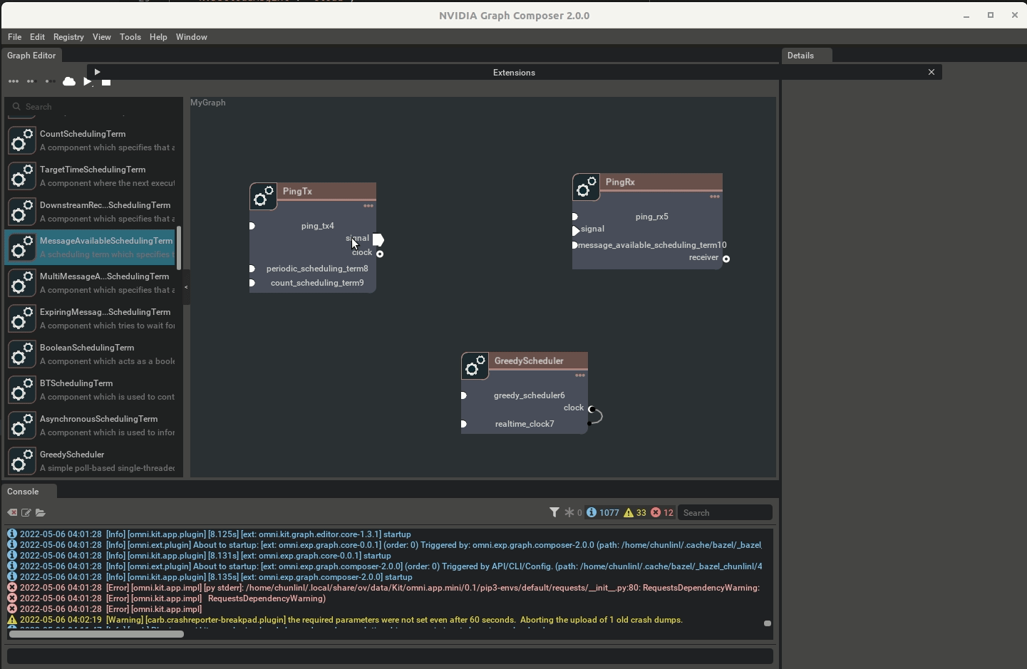 Add PingTx, PingRx and GreedyScheduler by dragging and dropping them from the components panel the graph window.