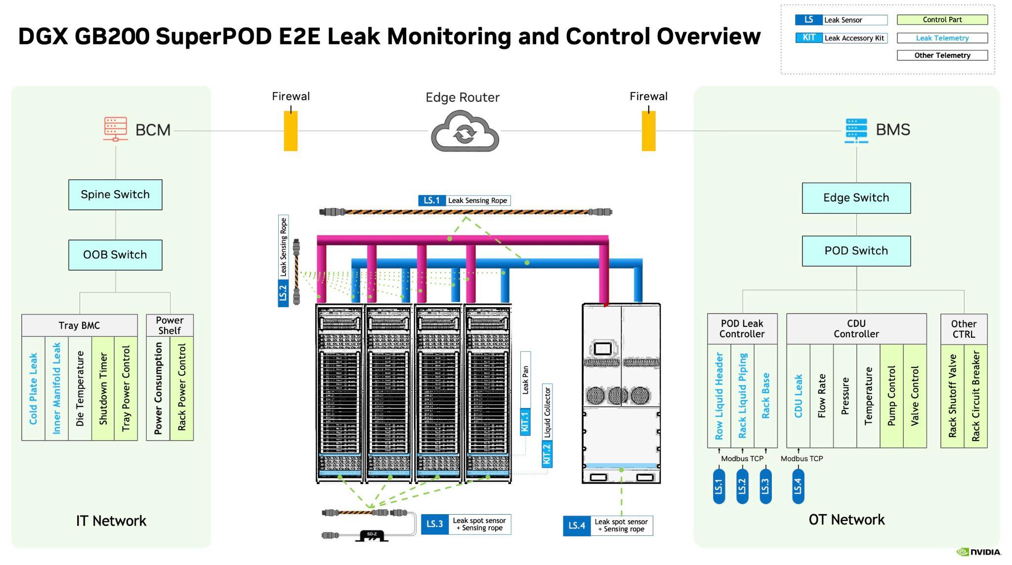 For GB200/GB300 NVL72 systems, tray level liquid detection is handled by the system BMC on compute tray / switch tray. The rack level liquid detection is handled by a customer provided building management system (BMS) operating in the operational technology (OT) side of the datacenter.