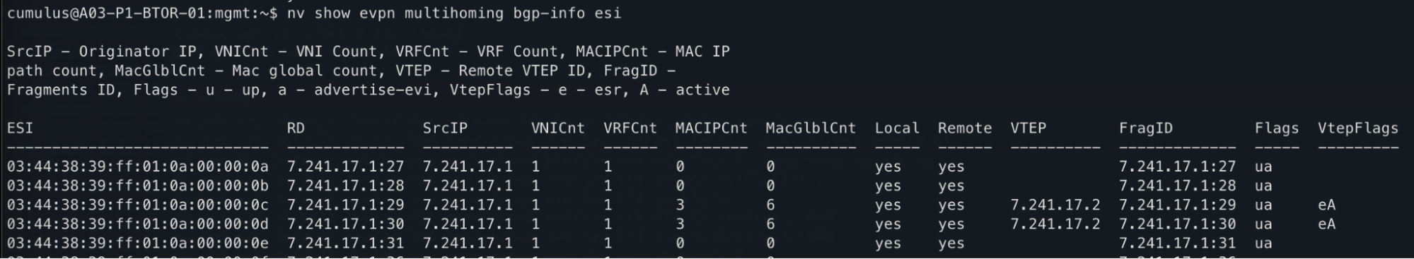 $ nv show evpn multihoming bgp-info esi