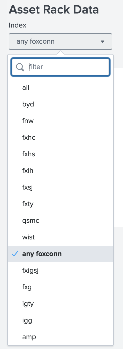 Select the factory index — In the Asset Rack Data form, open the Index dropdown and choose the factory index (for example, any foxconn or a specific site such as fxhc, fxlh, qsmc). Use the filter field to search if the list is long.