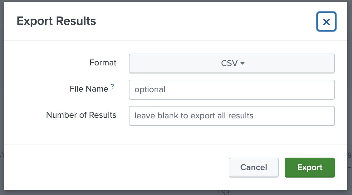 After you click the download icon, the Export Results dialog appears. Set Format to CSV, optionally enter a File Name, and leave Number of Results blank to export all results (or enter a limit). Click Export to download the file.