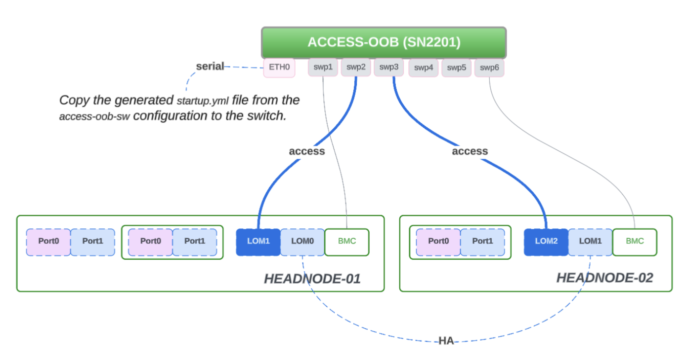 The following diagram shows the OOB management and bootstrap connectivity between the BCM headnodes and the Access-OOB switch (LOM and BMC connections). Copy the generated startup.yaml file from the Access-OOB switch configuration to the switch as part of the bootstrap workflow.
