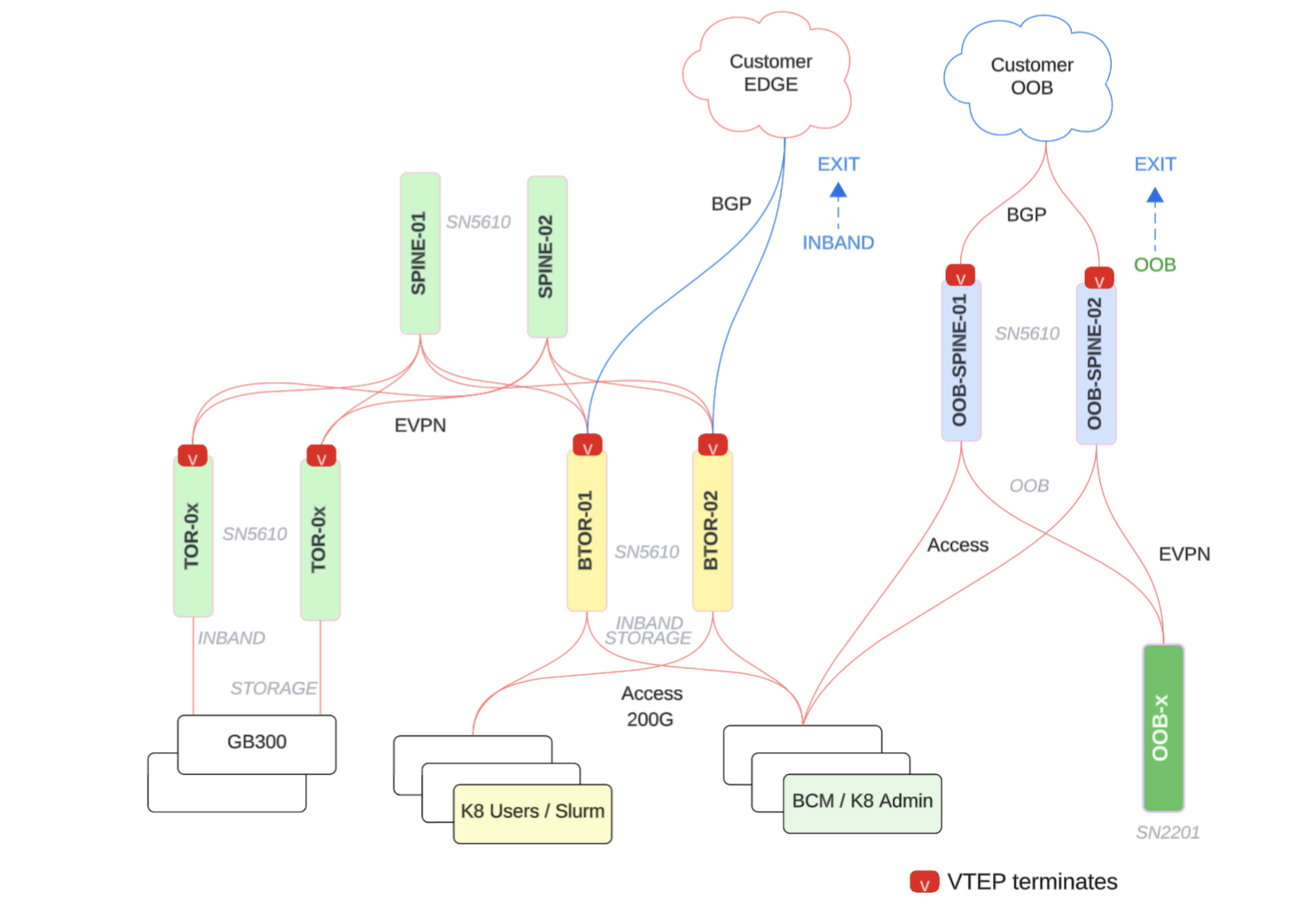 The edge network is the network that connects the SuperPOD to the customer’s network and includes the following: