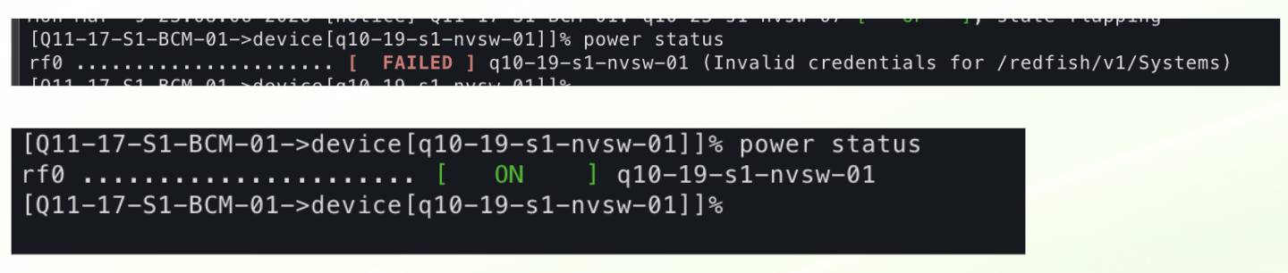 Confirm OOB power control of the NVLink Switches using a power status check in BCM, similar to what was done for a DGX compute tray (GB200/GB300).