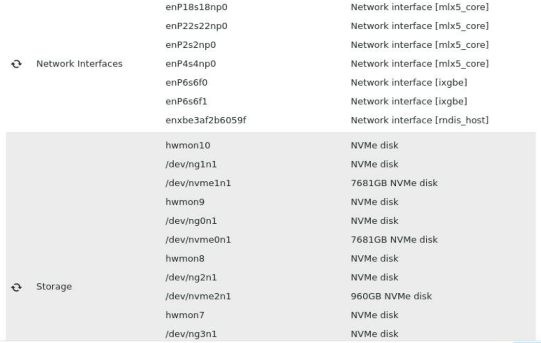 root@a03-p1-nmxm-x86-01:~# lshw -c disk -businfo Bus info Device Class Description ------------------------------------------------------------- hwmon1 disk NVMe disk /dev/ng1n1 disk NVMe disk nvme@1:1 /dev/nvme1n1 disk 960GB NVMe disk hwmon0 disk NVMe disk /dev/ng0n1 disk NVMe disk nvme@0:1 /dev/nvme0n1 disk 960GB NVMe disk hwmon3 disk NVMe disk /dev/ng2n1 disk NVMe disk nvme@2:1 /dev/nvme2n1 disk 7681GB NVMe disk hwmon2 disk NVMe disk /dev/ng3n1 disk NVMe disk nvme@3:1 /dev/nvme3n1 disk 7681GB NVMe disk