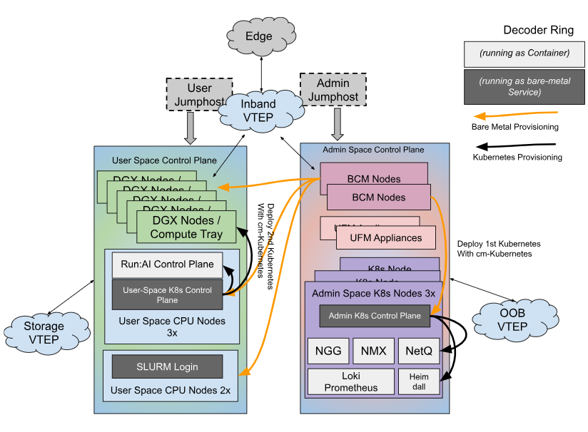 To ensure that services that are responsible for administration of the cluster (admin-space, privileged users) and non-privileged user access (user space) are separated, NVIDIA has two sets of control plane nodes.