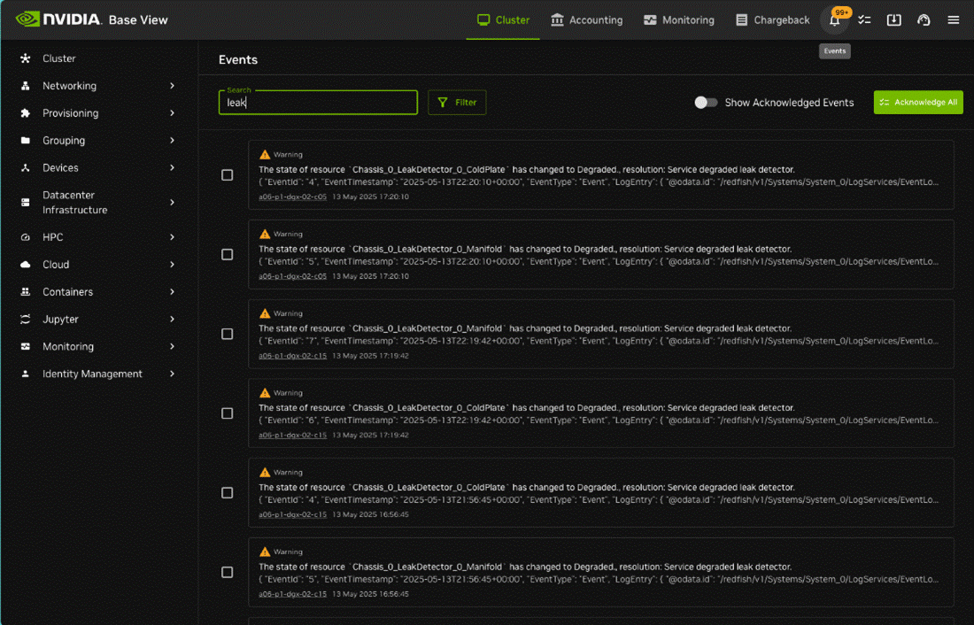The GB200 system uses liquid cooling to achieve its scale-out density and efficiency. With a liquid, there is the chance for leaks and the GB200 system implements several fail-safes to avoid the worst effects of these. From an administrative point of view, these events will be collated within BCM.