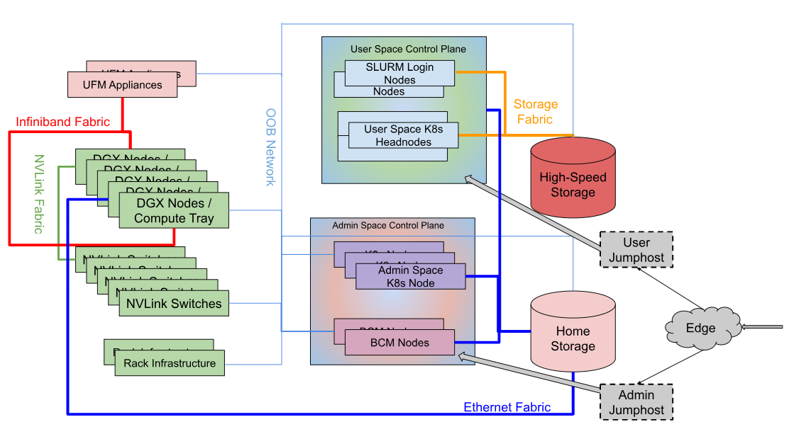 The User Jumphost is the gateway into the DGX SuperPOD intended to provide a single entry-point into the cluster and additional security when required. It is not actually a part of the DGX SuperPOD, but of the corporate IT environment. This function is defined and provided by local IT requirements. |