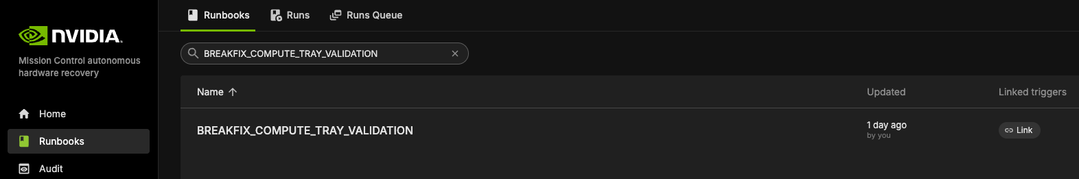Access the NVIDIA Mission Control autonomous hardware recovery portal using your credentials and navigate to the Runbooks section.