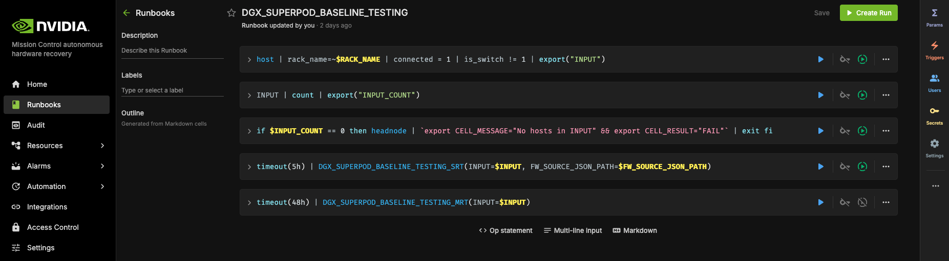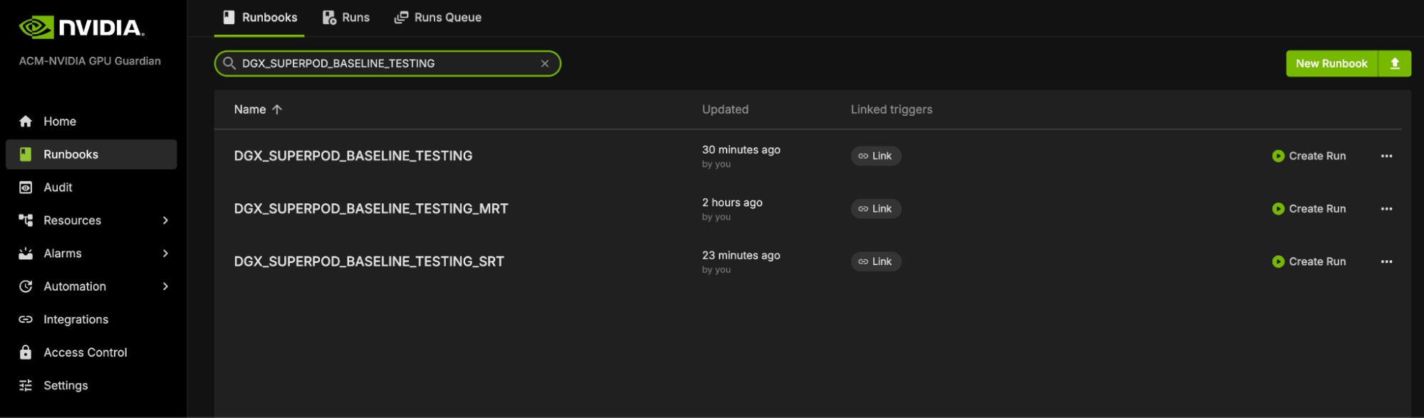 Locate the “DGX_SUPERPOD_BASELINE_TESTING” runbook through the search functionality (please reference the interface depicted below)