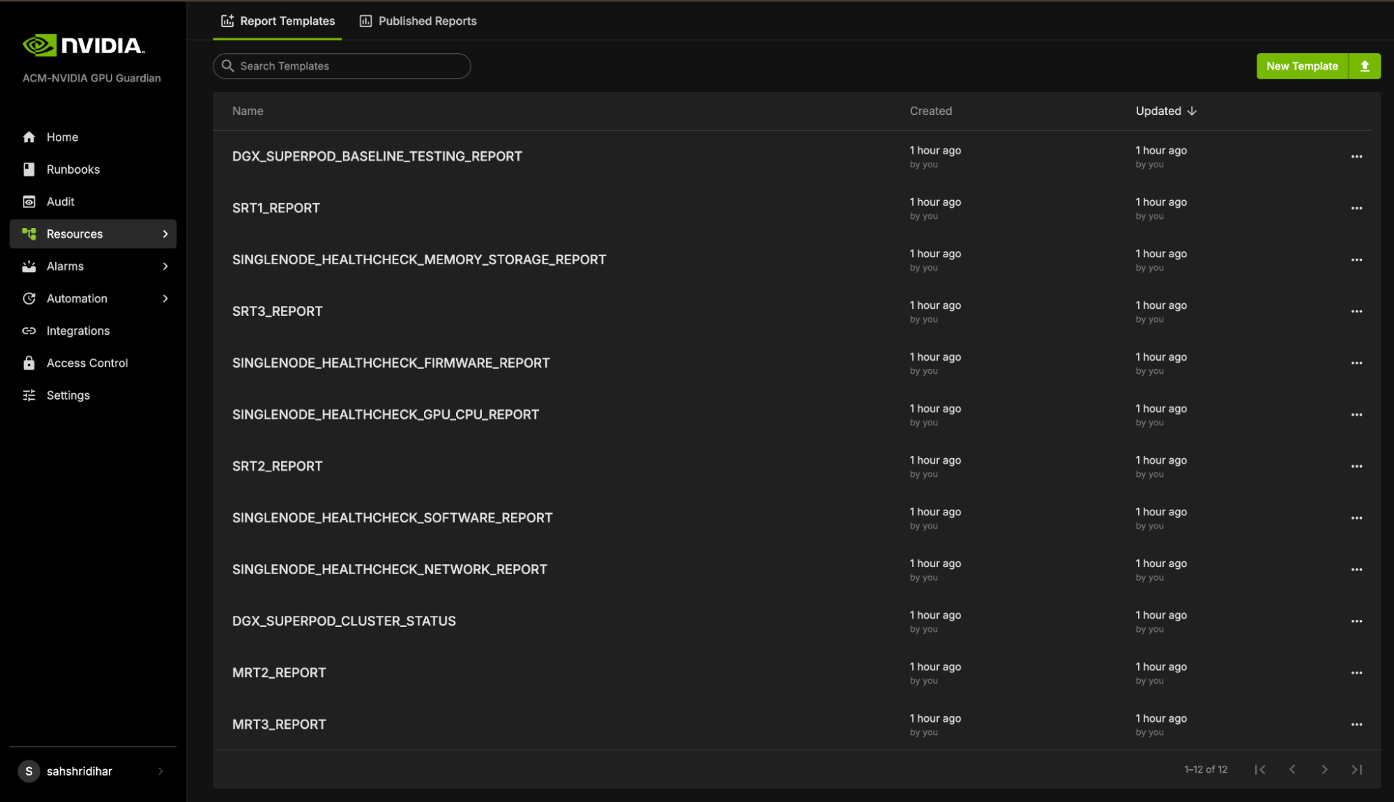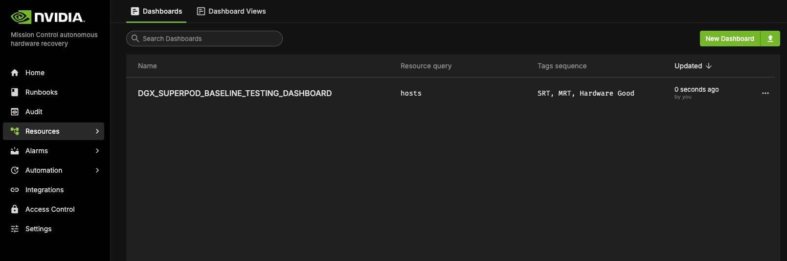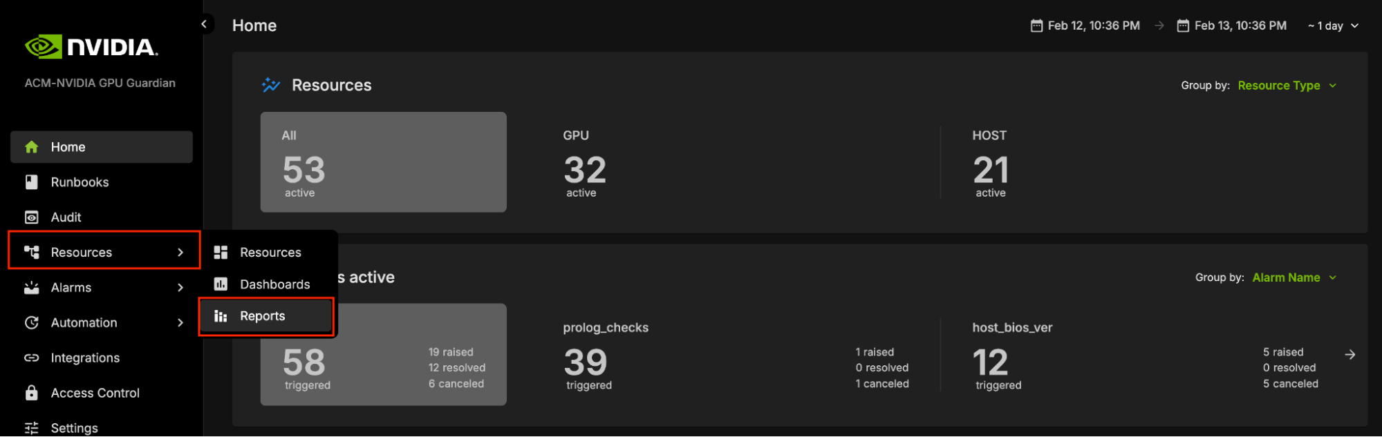 To access the NVIDIA Mission Control autonomous hardware recovery reports, click on Resources in the side menu, then select Reports.
