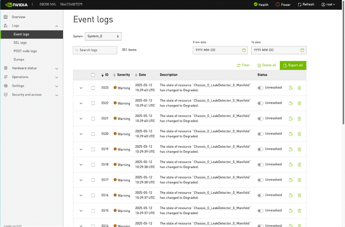 [a03-p1-head-01]% device use a06-p1-dgx-02-c18 [a03-p1-head-01->device[a06-p1-dgx-02-c18]]% bmceventlog Device id message severity timestamp type Result Error ------------------ ------------- ---------------------------------------------------------------- ---------------- -------------------------- ------------ -------- -------------------------------- a06-p1-dgx-02-c18 5424 The state of resource `Chassis_0_LeakDetector_0_Manifold` has Warning 2025-05-12T10:28:41+00:00 good changed to Degraded.