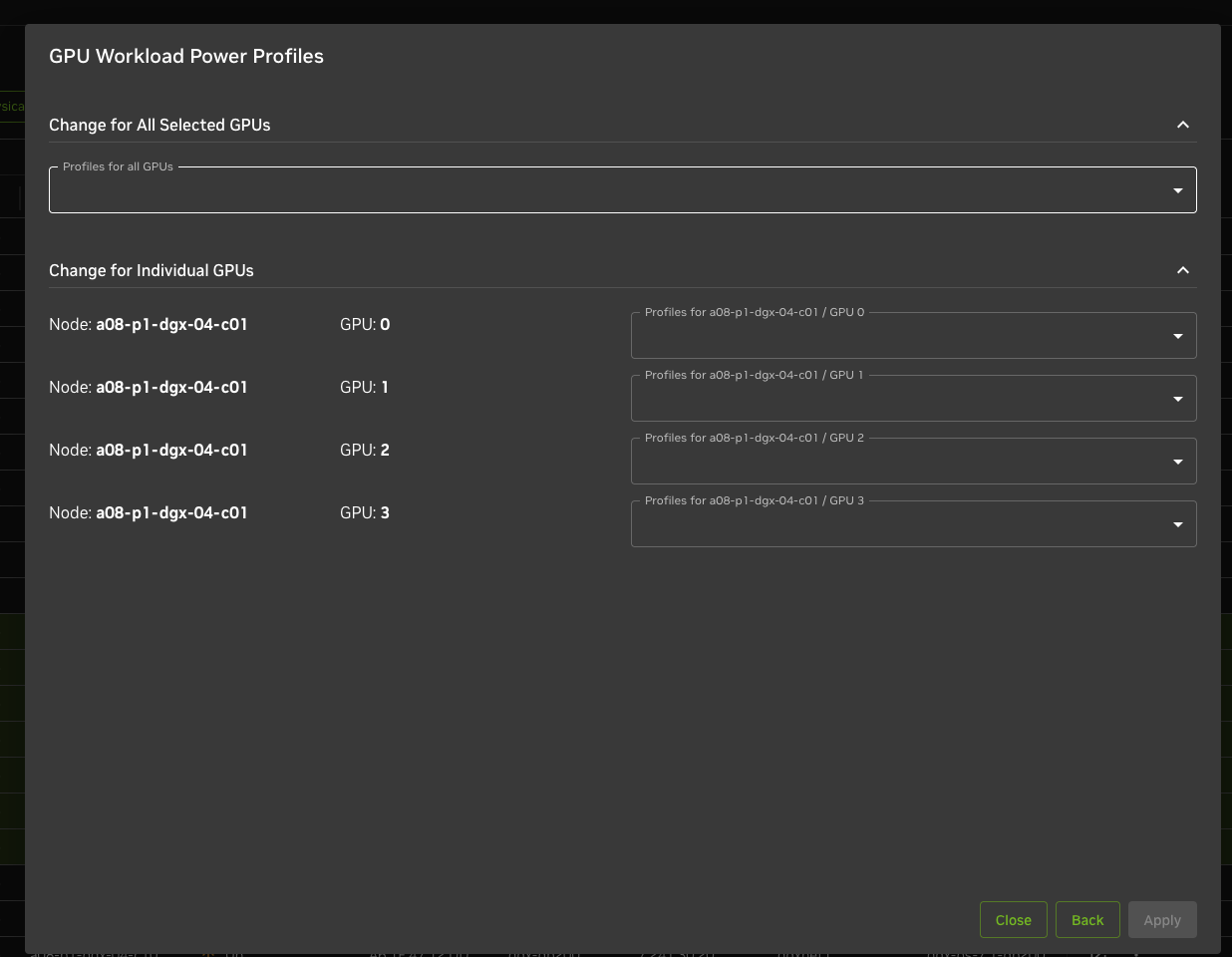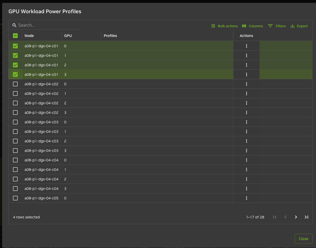 GPU Workload Power Profiles bulk action option Bulk profile change dialog