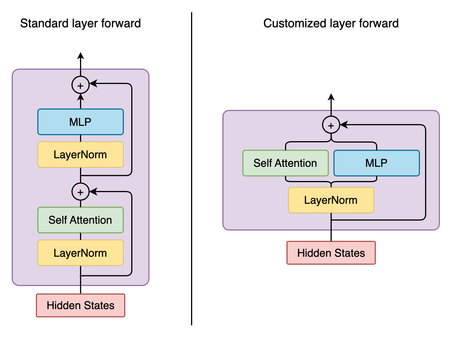 Here is a diagram showing the forward functions of conventional Mcore GPTModel v.s. Falcon.